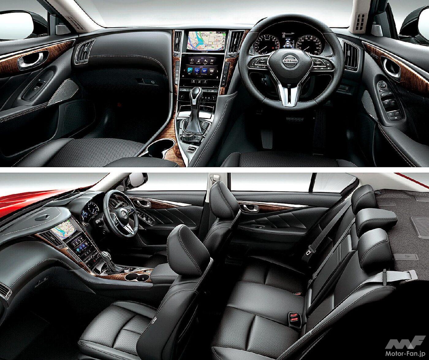 2019年7月に行なわれたマイナーチェンジでは、フロントグリルに“Vモーショングリル”を採用し、より力強く洗練されたデザインに進化しました。また、リヤコンビランプには丸目4灯のデザインを復活させ、伝統と現代性を融合させています。さらに、エンブレムをインフィニティから日産に戻し、ブランドのアイデンティティを強調しました。このマイナーチェンジでは、ハイブリッドモデルに日産の先進運転支援システム“プロパイロット2.0”を市販車として初めて採用し、より高度な運転支援を提供しています。また、従来のダイムラー製4気筒ターボエンジンに代わり、自社製のV6 3.0Lツインターボエンジンを採用、高性能グレードの『400R』も追加されました。