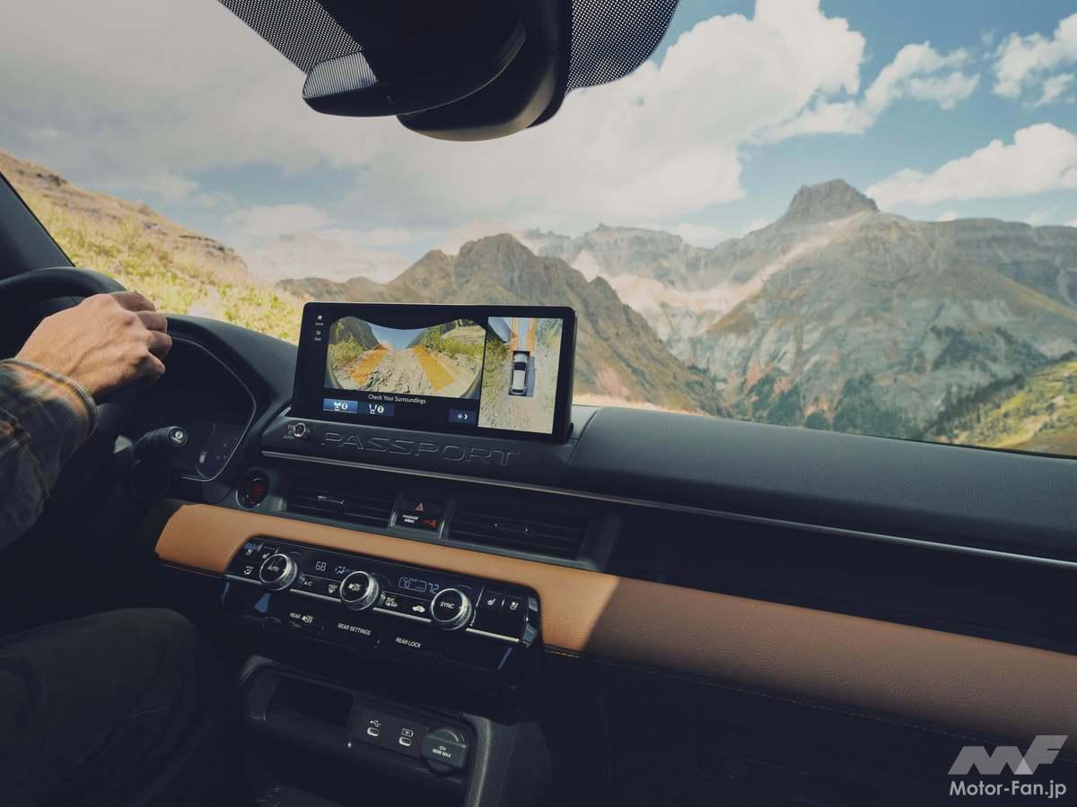 パスポートの新しいフロントエンドは、大胆なグリル、長いボンネット、アグレッシブなフードスクープを備え、力強くパワフルなデザインに変更。トレイルスポーツモデルには、独特なアンバー照明を特徴とする新しいLED DRLシグネチャーが採用されている。ダッシュからアクスルまでの比率が高められたタフで野心的なデザインで、「PASSPORT」の文字がフロントフェイシアとスチール製テールゲートに堂々と刻印されている。フレアフェンダー、ワイドなトレッド、そして全パスポートに装備された31インチのタイヤを履く18インチのホイールが、パワフルなスタンスを強調する。