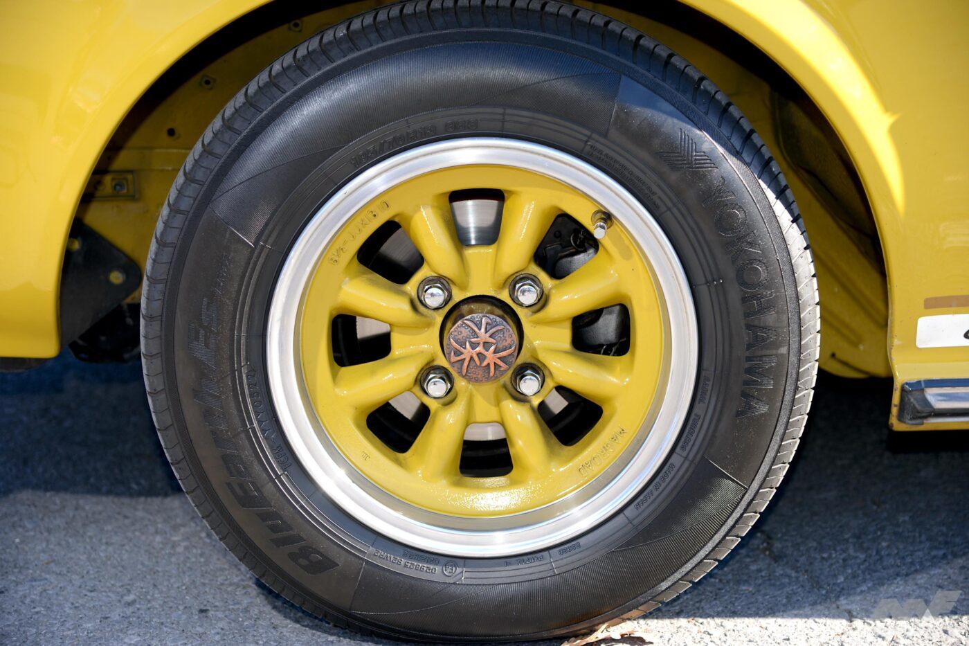 新車からのワンオーナー車なので、カスタムや改造はほぼない。長くトヨタディーラーでメンテナンスされてきて、今も新車時の状態をよく保っている。唯一変更したのがアルミホイールで、ボディカラーと同じイエローの8スポークタイプを選んでいる。面白いのはセンターに装着するハブキャップ。アルミホイールにも付属していたのだろうが、森脇さんは銅素材から自作したものを組み合わせている。表面には森脇さんの森の字があしらわれていて、自作にこだわった理由だ。