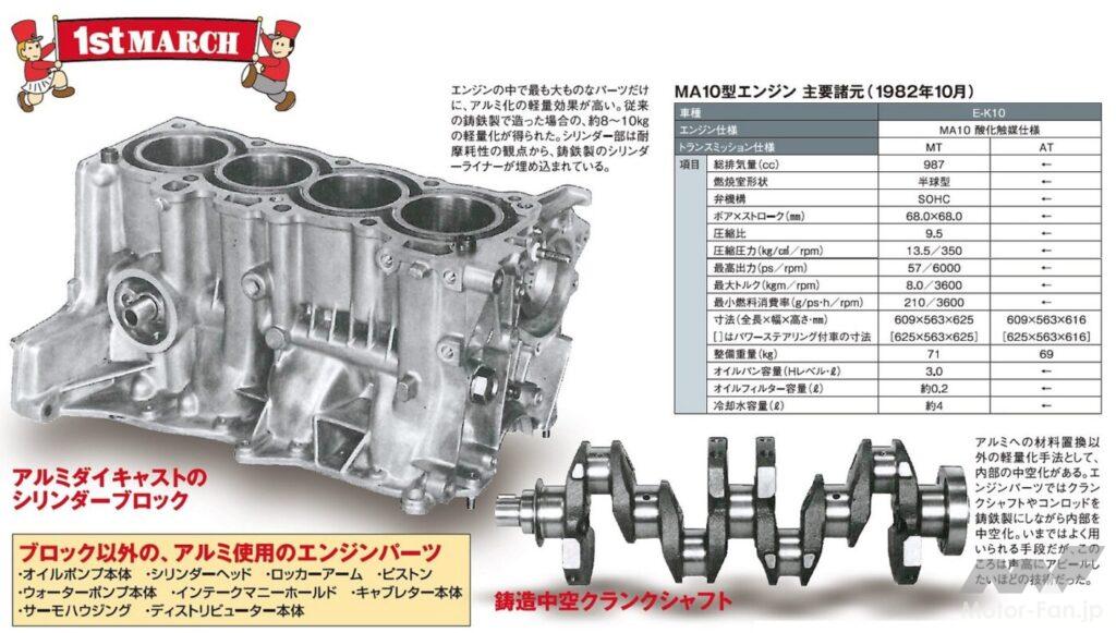 全域での性能向上とレスポンスを向上したマーチスーパーターボは、最高出力110ps/最大トルク13.3kgmを発生。そのパワーは、1.6Lクラスのスポーツモデルさえ上回り、リッターあたりの出力は何と118ps、この値は当時国産車最強だった。