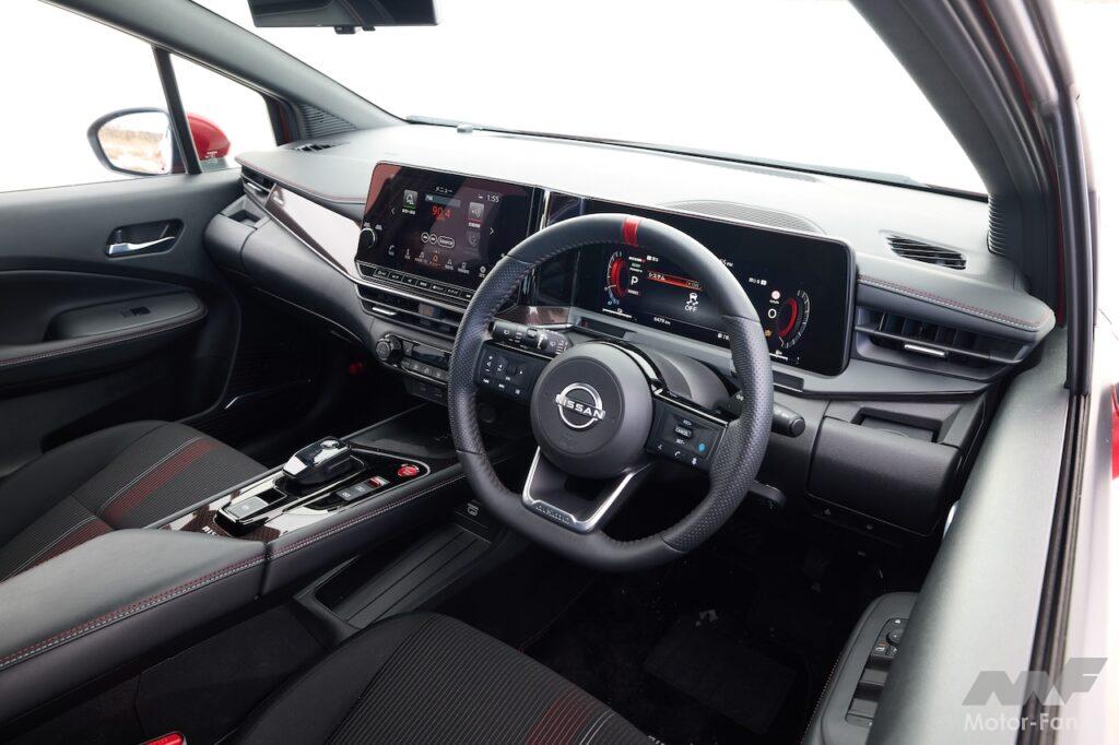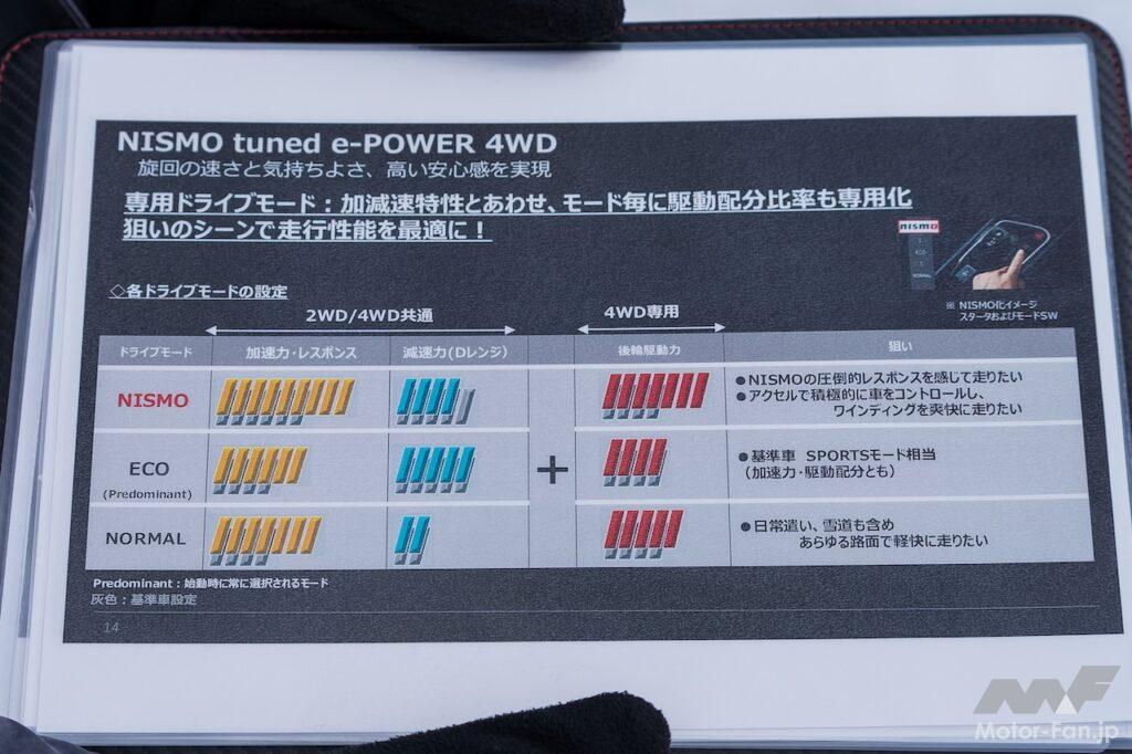オーラNISMO tuned e-POWER 4WDにはNORMAL、ECO、NISMOの3種類のドライブモードが用意されている。ECOは「アクセルオンで常にアンダーステア(運転に不慣れでも安心)」、NORMALは「アンダーステアが抑制され、ライントレース性が向上」、NISMOは「アクセルで自在に向きを変えられる。ドライ路面でアクセル全開旋回が可能」な設定だ。最高出力60kW、最大トルク150Nmを発生する後輪の駆動力はECO→NORMAL→NISMOの順に強くなっていく。