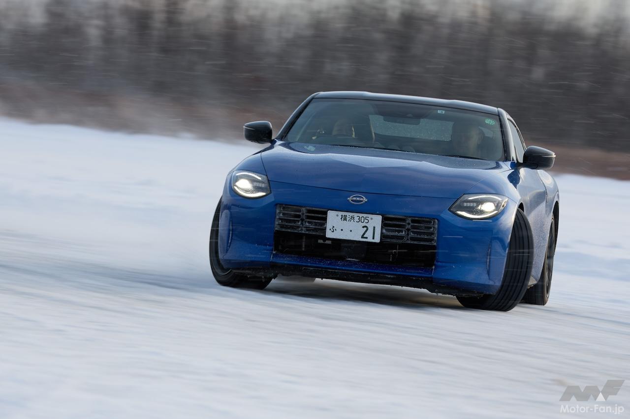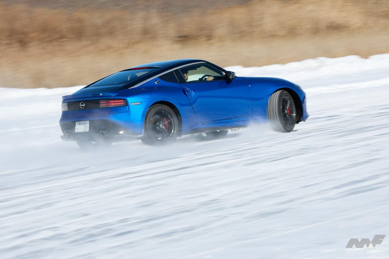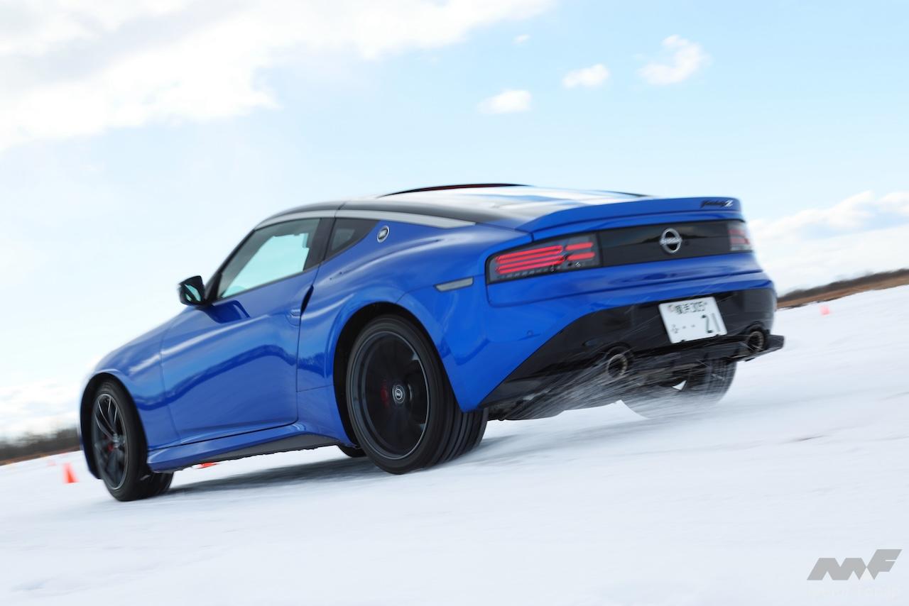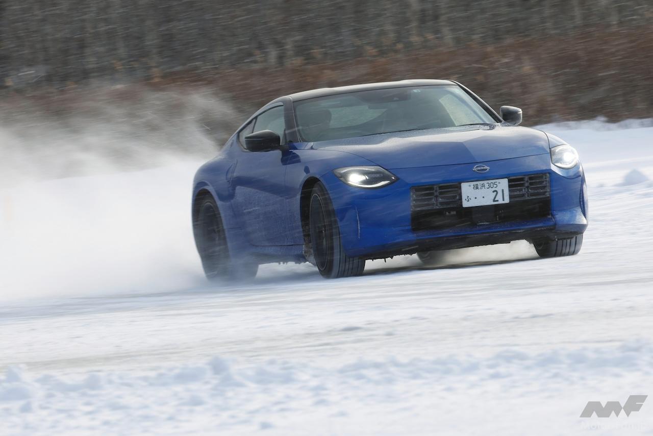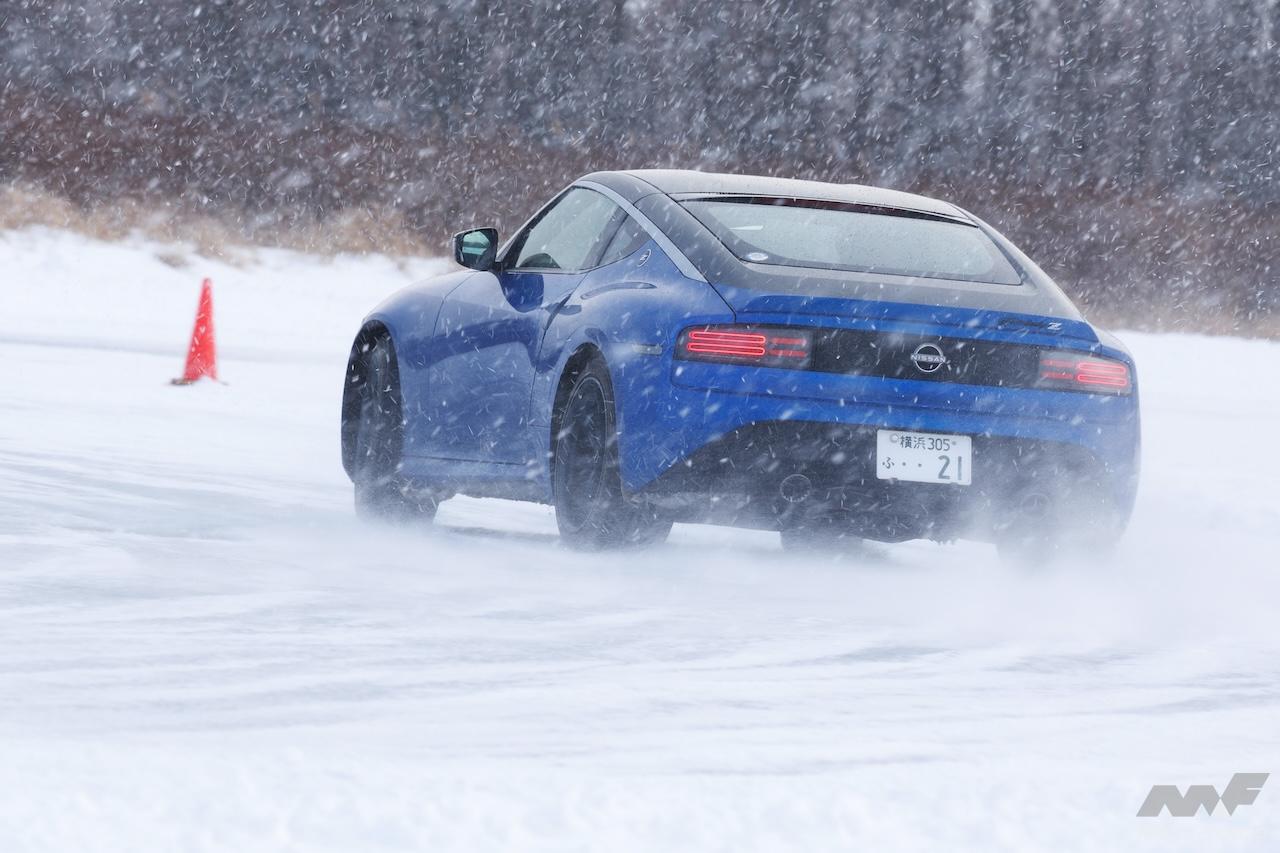 Zの場合、すべりやすい雪上のような路面では、後輪がグリップ限界を超えるとお尻を振り出し、進みたい方向に進まなくなる。少しでもラフなアクセル操作をしようものなら、即座にスピンモードに陥る。乾燥舗装路での卓越したパフォーマンスを知っているだけに、もどかしい思いがする。