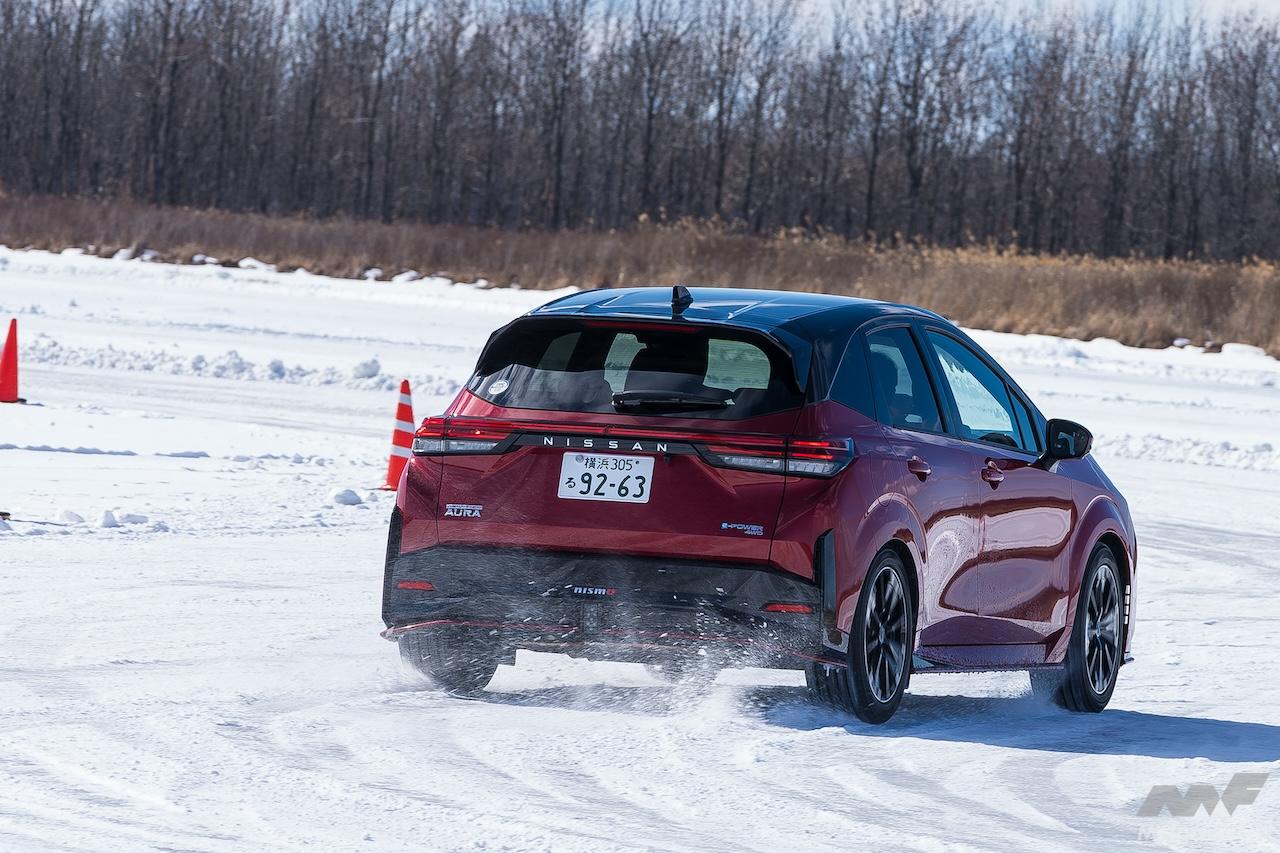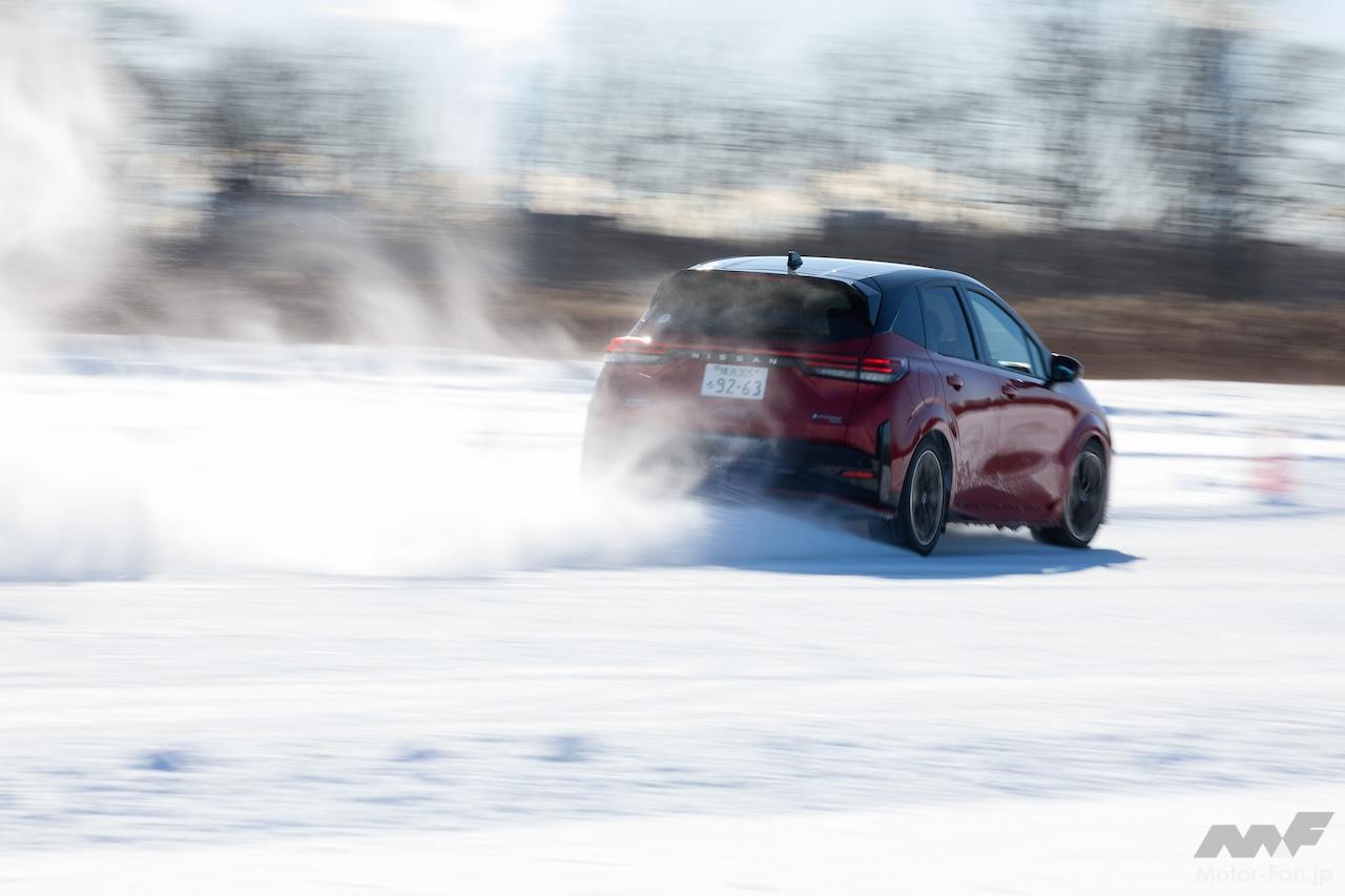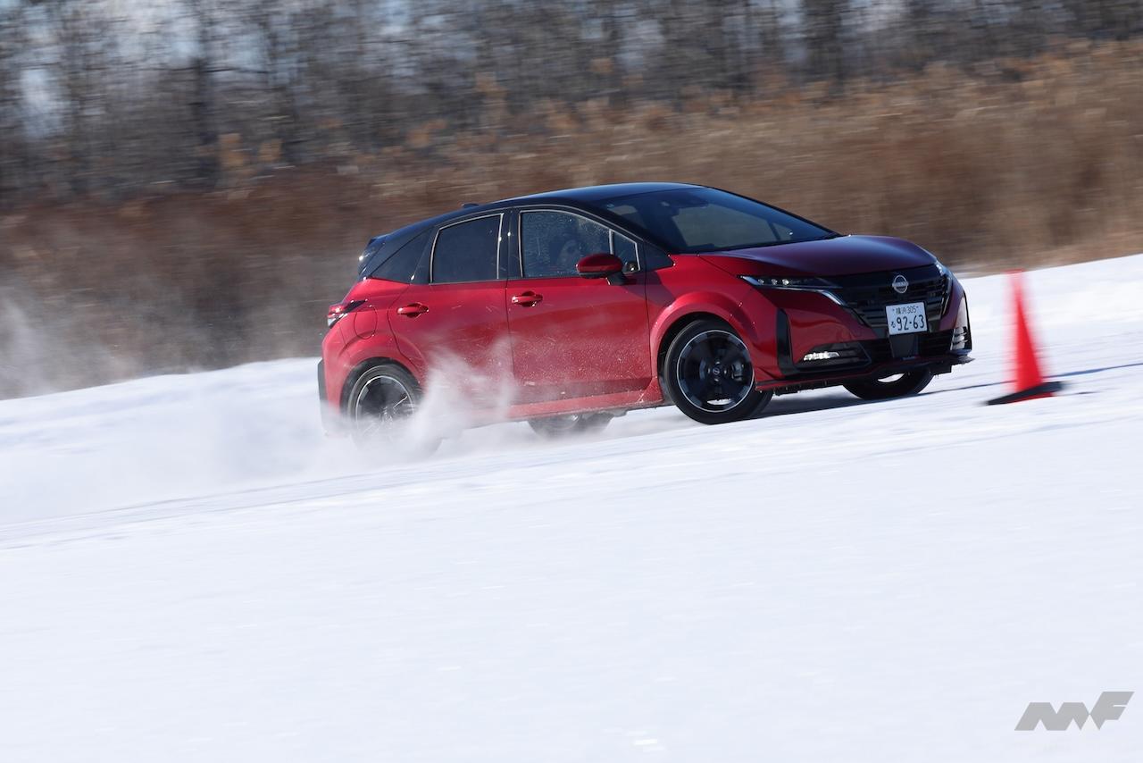 もっと極端なのはNISMOモードだ。切り換えた途端にスピンした。華麗な(?)360度ターンになったのは結果論である。乾燥舗装路でパイロンスラロームに臨むとタイトなS字ラインを描いて俊敏にクリアする動きを披露する(テストコースで体験している)。NISMOモードはドライのタイトコーナーで真価を発揮するつくりになっているため、すべりやすい雪上ではリヤの駆動力が過多になりがちで、デリケートなアクセルワークが求められる。リヤハッピーの走りを自分のものにすると、もっと楽しめそうな気配を感じた。