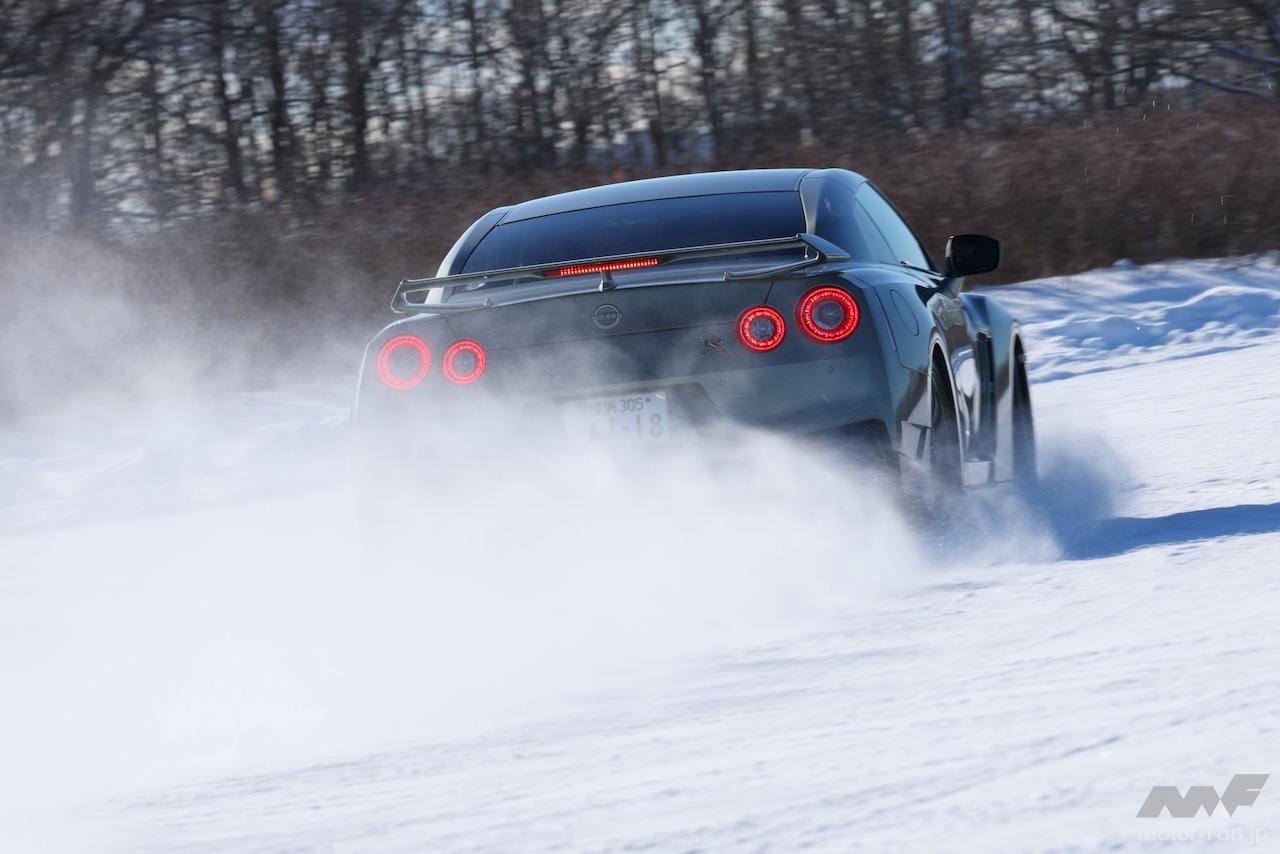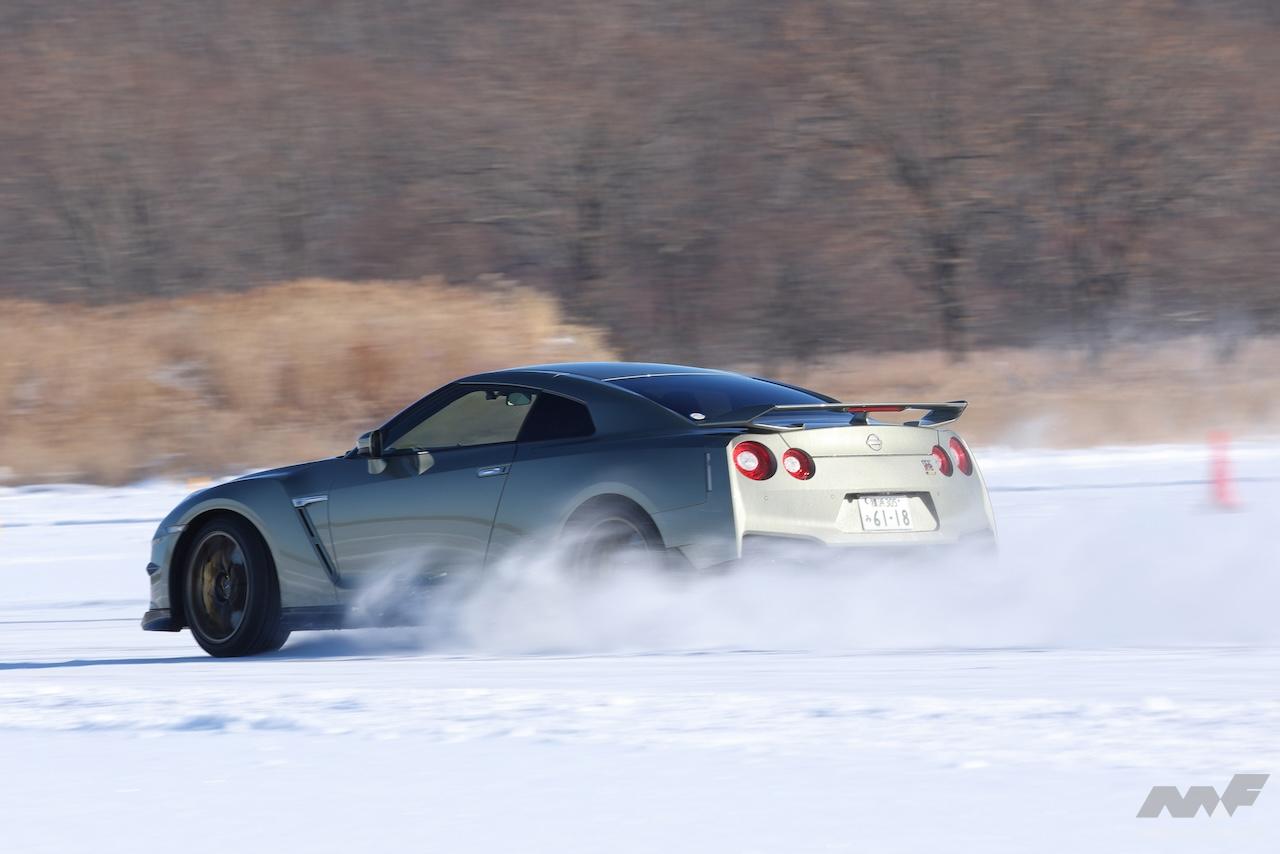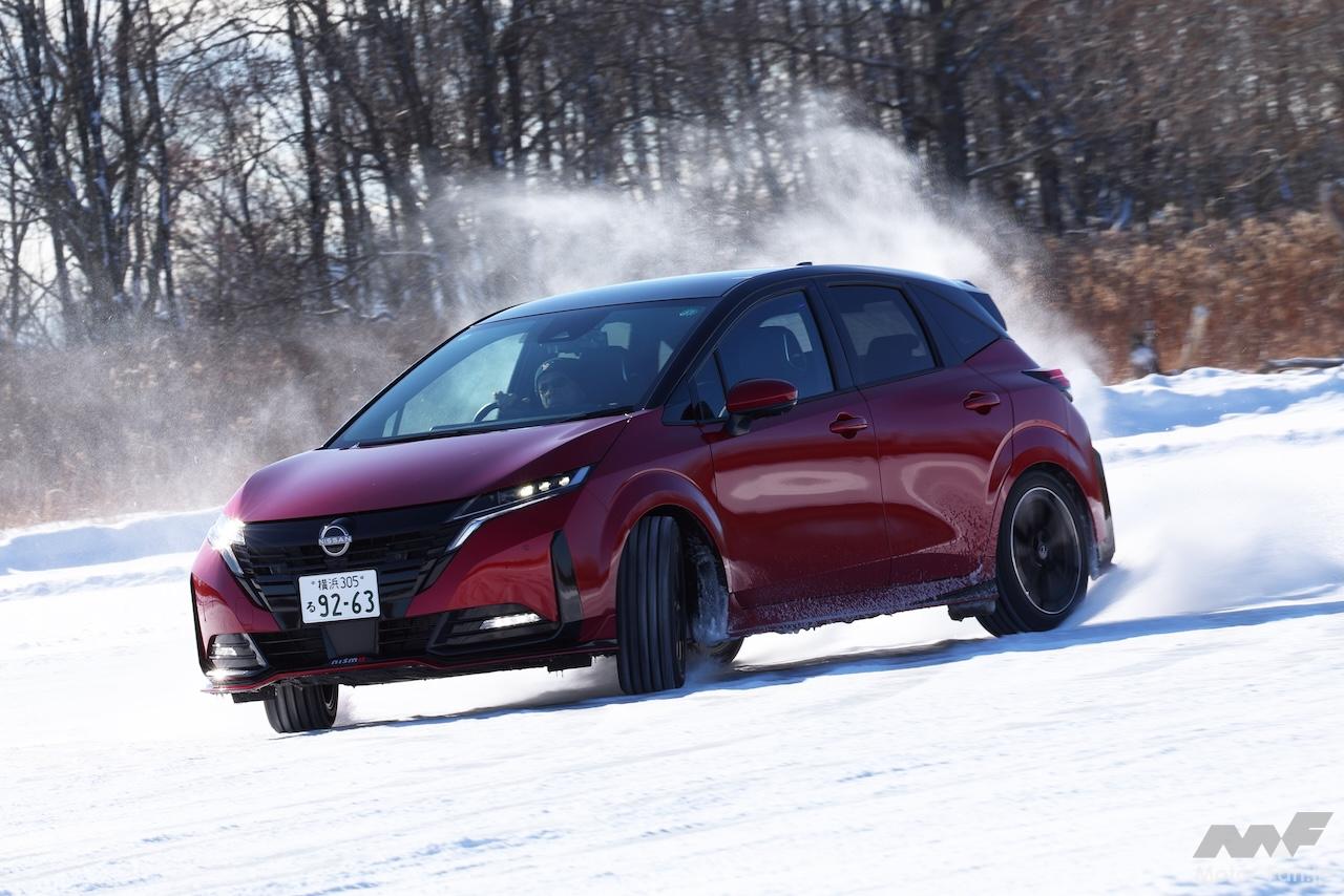もっと極端なのはNISMOモードだ。切り換えた途端にスピンした。華麗な(?)360度ターンになったのは結果論である。乾燥舗装路でパイロンスラロームに臨むとタイトなS字ラインを描いて俊敏にクリアする動きを披露する(テストコースで体験している)。NISMOモードはドライのタイトコーナーで真価を発揮するつくりになっているため、すべりやすい雪上ではリヤの駆動力が過多になりがちで、デリケートなアクセルワークが求められる。リヤハッピーの走りを自分のものにすると、もっと楽しめそうな気配を感じた。