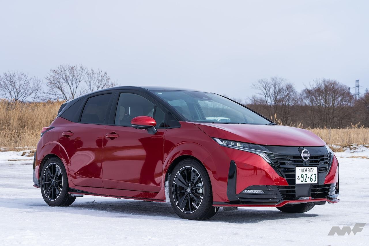 e-4ORCEのe-POWER 4WDに対する優位点は制御の速さだが、ことエクストレイル(e-4ORCE)対オーラNISMO(e-POWER 4WD)の対比でいえば、オーラNISMOのほうが圧倒的に軽い(1890kgのエクストレイルに対しオーラNISMOは1390kgで、500kg軽い)ため、制御の違いが明確な動きの差になって現れない。車重が圧倒的に軽いオーラNISMOは慣性がエクストレイルほど大きくないので、e-4ORCEほど制御が速くなくても充分に電動4WDの価値が享受できる(重いクルマほど、速く制御して動かしたり、止めたりしたい)。