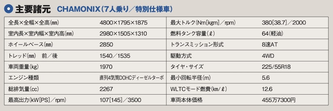 車両重量は1.9tオーバーと決して軽いとは言えないものの、スタート時の蹴り出し感が強力なのは8速ATの採用で1速ギヤ比が低いことや低回転域から大きなトルクを発するエンジン特性が功を奏していそう。同時に、高速域でのクルージングが得意科目なことも、ディーゼルエンジン搭載モデルゆえの美点のひとつだろう。コーナーを追い込むとアンダーステアがやや明確だが、総じて扱いやすいハンドリングの感覚は好印象。百花繚乱のミニバンが競い合うなか、ライバル知らずのオフロード能力を備える色濃い個性の持ち主である。