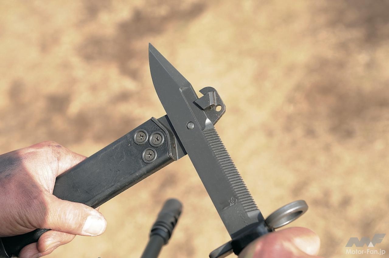 給弾方法は弾倉(マガジン)式。装弾数は弾薬を収納するマガジンにより異なる。30発を収納できるカーブしたタイプと20発の箱型だ。銃の構成部品点数は64式小銃に比べると少なく、分解・組み立てもやりやすい。銃剣を着剣することも可能。この銃剣は鞘と組み合わせることで、鉄条網などを切断するワイヤーカッターとして使用できる。銃剣はいわゆるサバイバルナイフだ。