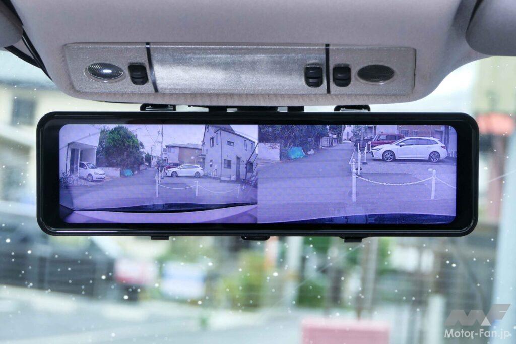 また、描写力だけでなく通常の鏡では実現できないワイドな視野も見どころ。モデルやカメラの取り付け位置によっては、車両後方だけでなくピラーサイドやバンパー直下などこれまで視認できなかったエリアも表示してくれる。さらに、機種によってはバックギアと連動し後方全体とバンパー直下を2画面に分けて表示してくれるため、死角を最小限に留めてくれる安心感も見どころと言える。