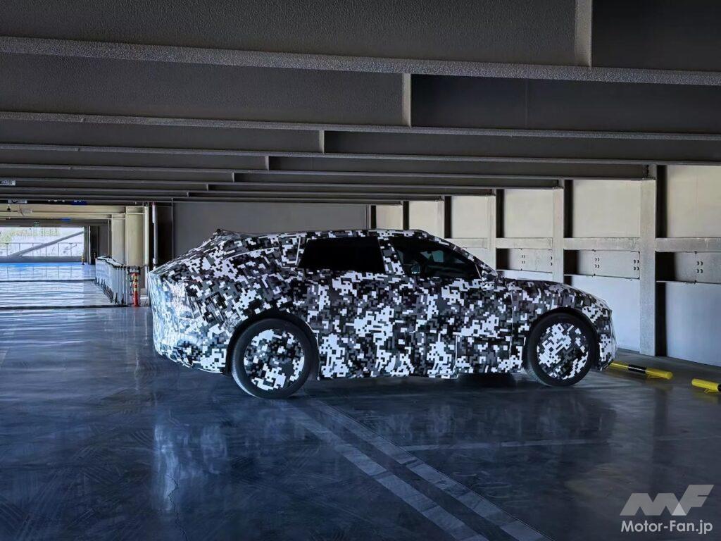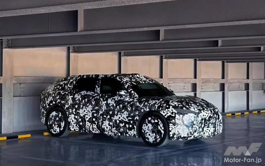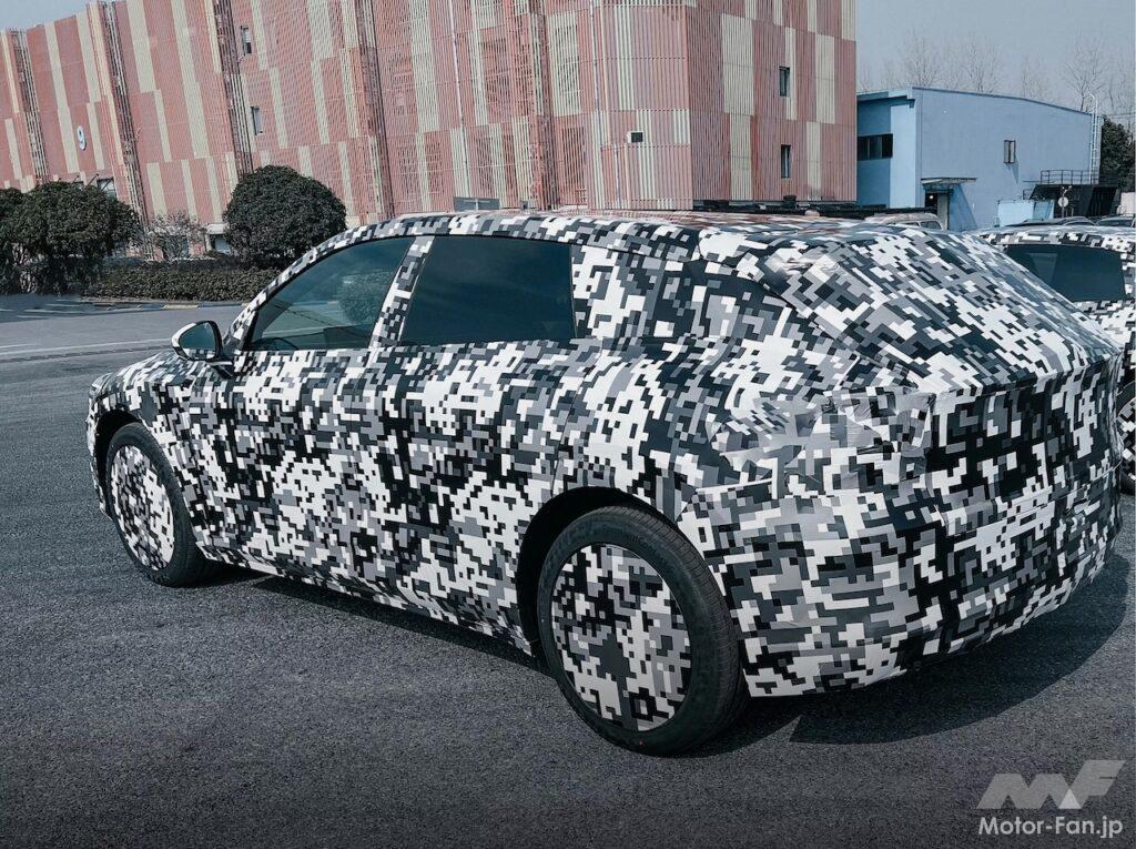 リヤエンドもかなり厳重にカモフラージュしているが、角張ったリヤウィンドウとルーフに取り付けられた、スポイラーと思われるものが装備されていることがわかる。さらに下にはミッドマウントのスポイラーが見え、凹型の下部リフトゲートも確認できる。最終的なデザインは断言できないが、キア「EV6」のような雰囲気も感じられる。
