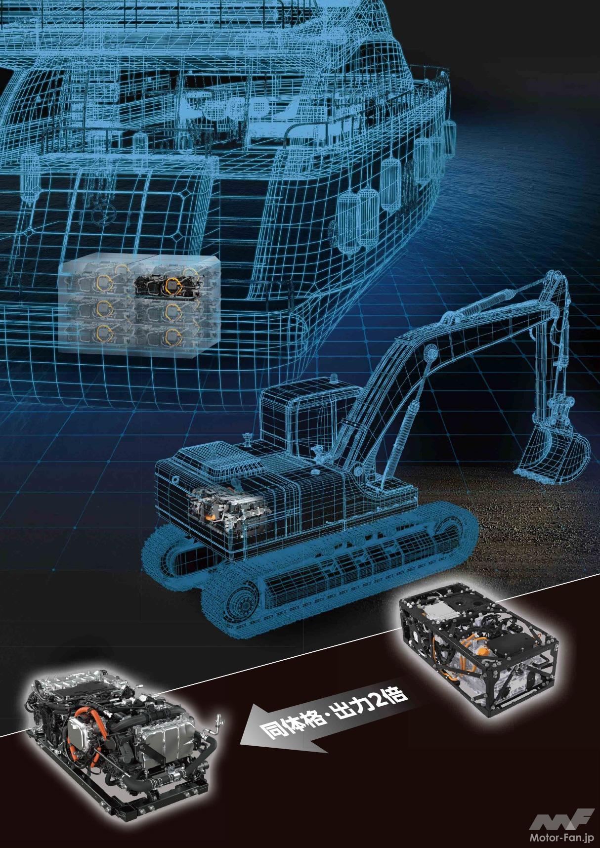 汎用向けユニットは第2世代と並べて展示されていた。第3世代は第2世代と同等の体格に見えるが、革新的セルの採用で2倍の出力を発生する。展示物の背後に描かれている船と建機は汎用向けユニットの代表的な用途だ。乗用車よりも高い出力を発生し、船や建機のほか、定置式発電機やバス、電車への適用も想定しているという。