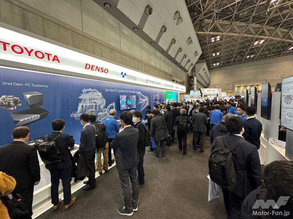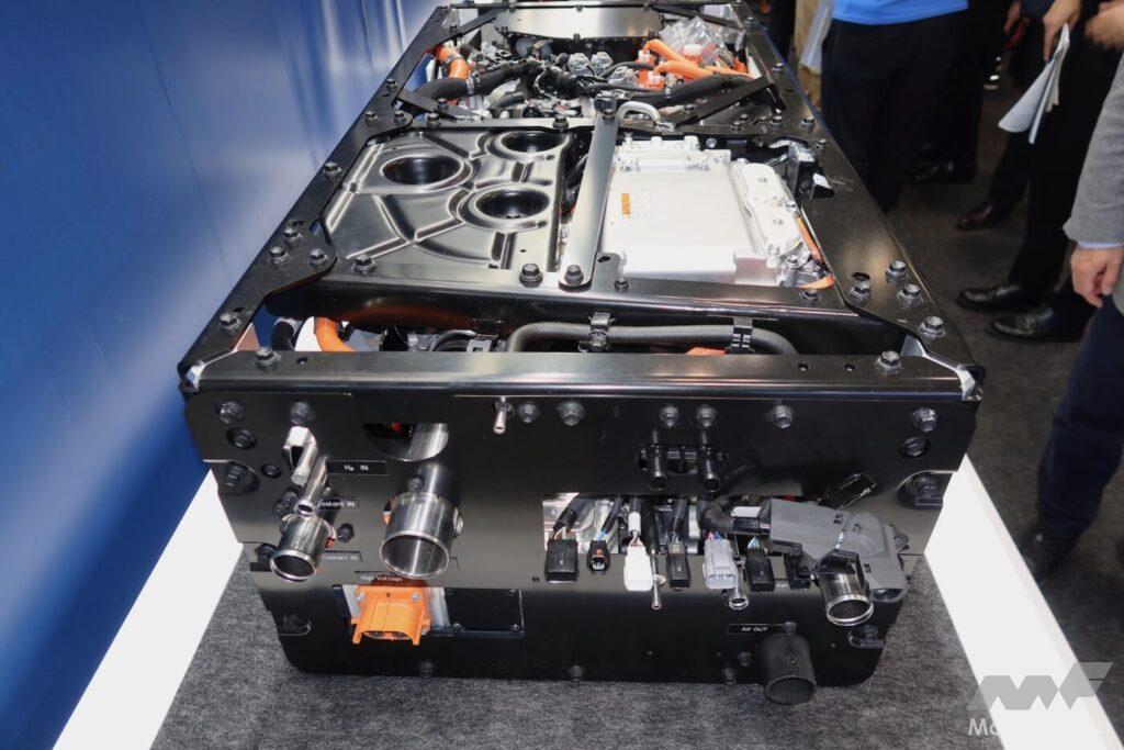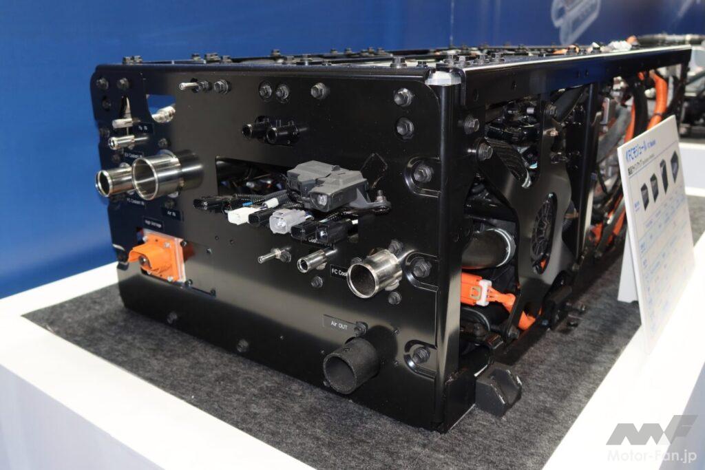 展示状態の右側がフロントで、ここから空気が入り、大型のエアコンプレッサーで加圧され、底部の水冷インタークーラーで冷却されて、奥の小口側からFCスタックに入る。汎用向け、乗用車(小トラ)向け、商用車(大トラ)向けともにセルは共通。共通設計にすることでコストを下げている。新開発したセルは材料や構造を変更することで性能と耐久性を向上。第2世代FCシステムの製造ラインを活用することで投資を抑える考えだ。日本や欧州、北米、中国などの市場に投入する予定である。