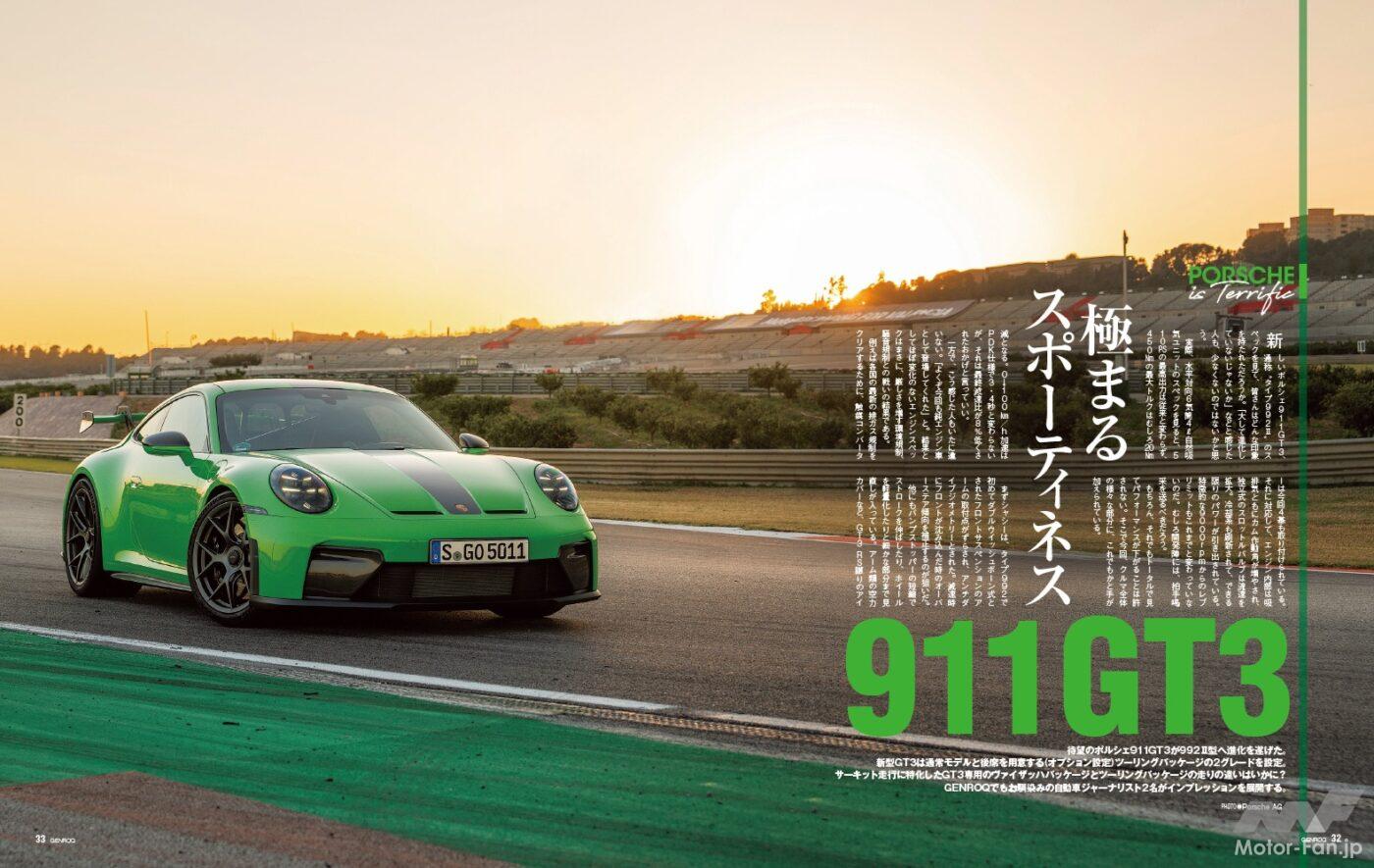 世界のスーパースポーツカーや高級車を取り上げるゲンロク。最新4月号の巻頭特集は「ポルシェ」。新型911 GT3/GT3ツーリングパッケージに初試乗するほか、話題の名車911 S/Tの日本での走りをレポートしている。また、新しくなった“スポーツカー界のメートル原器”、タイプ992II 911カレラのライバルとの比較検証を行っている。