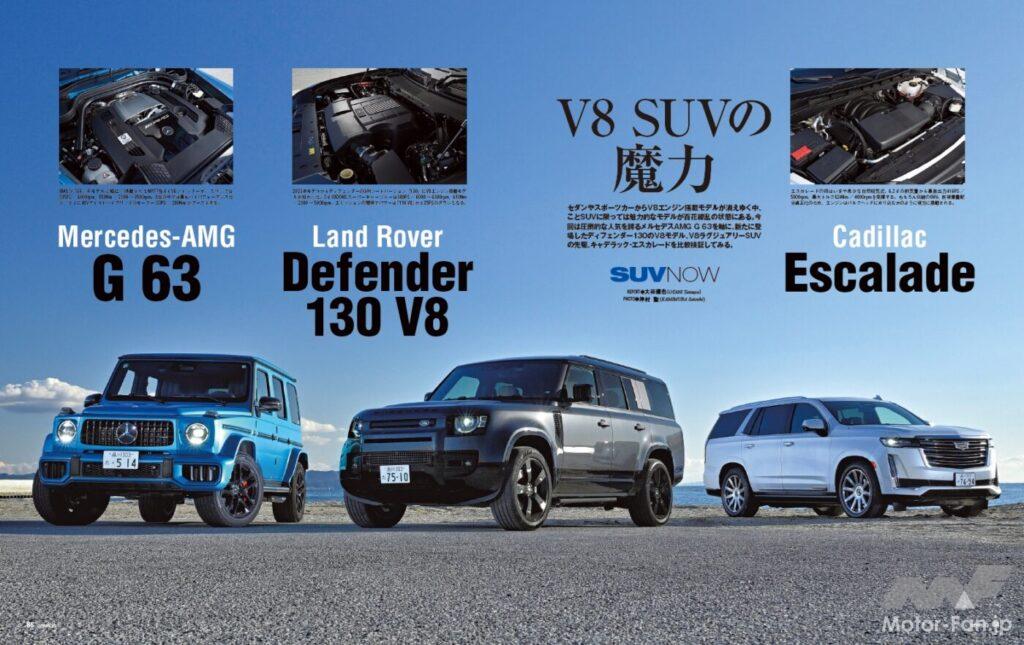 また、スポーツカーでは下火になりつつあるV8エンジンを搭載したSUVを掘り下げる『V8 SUVの魔力』を掲載。ここではメルセデスAMG G63を軸に、ランドローバー・ディフェンダー130 V8、キャデラック・エスカレードを対決させている。