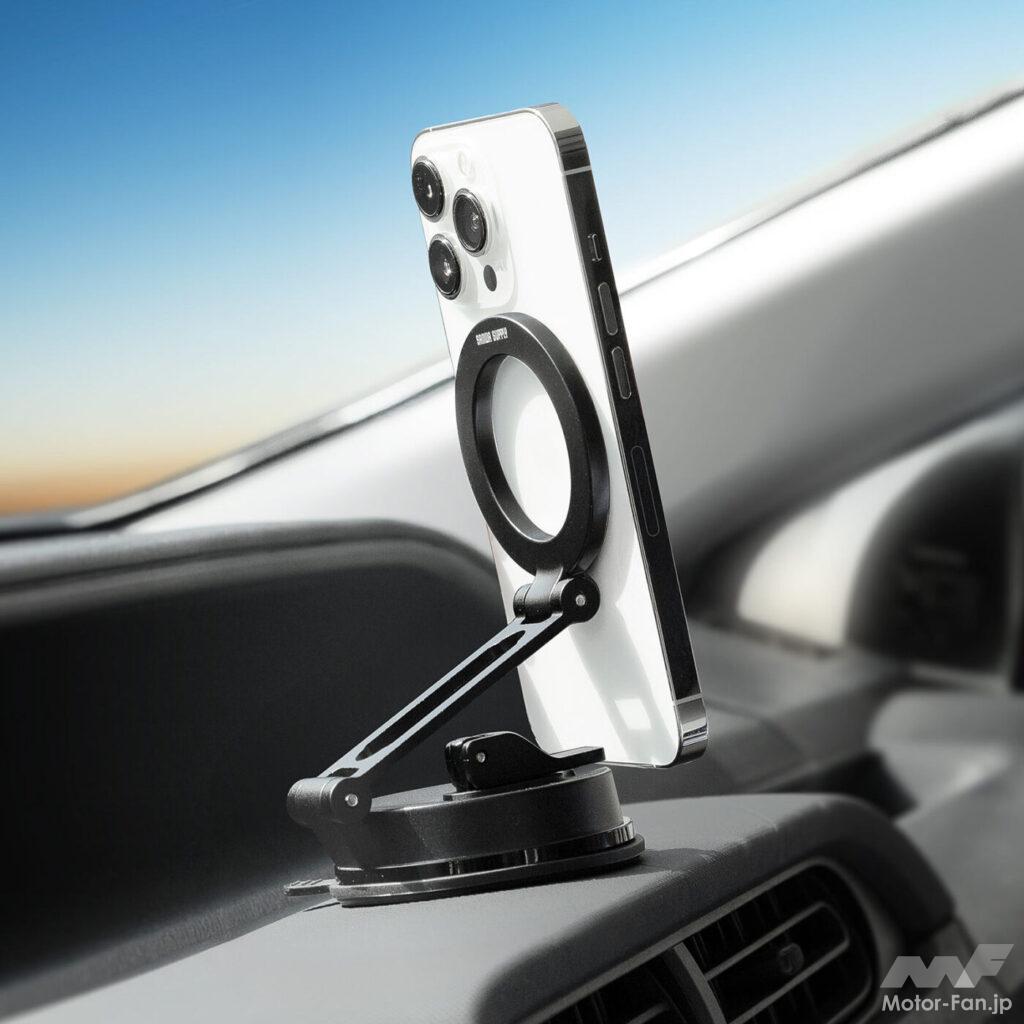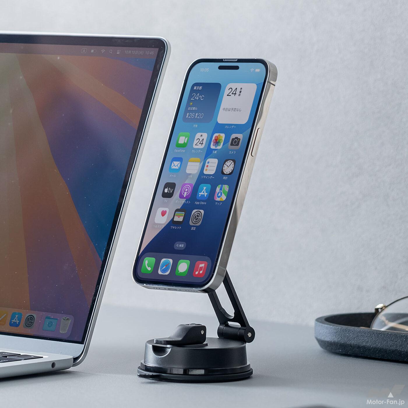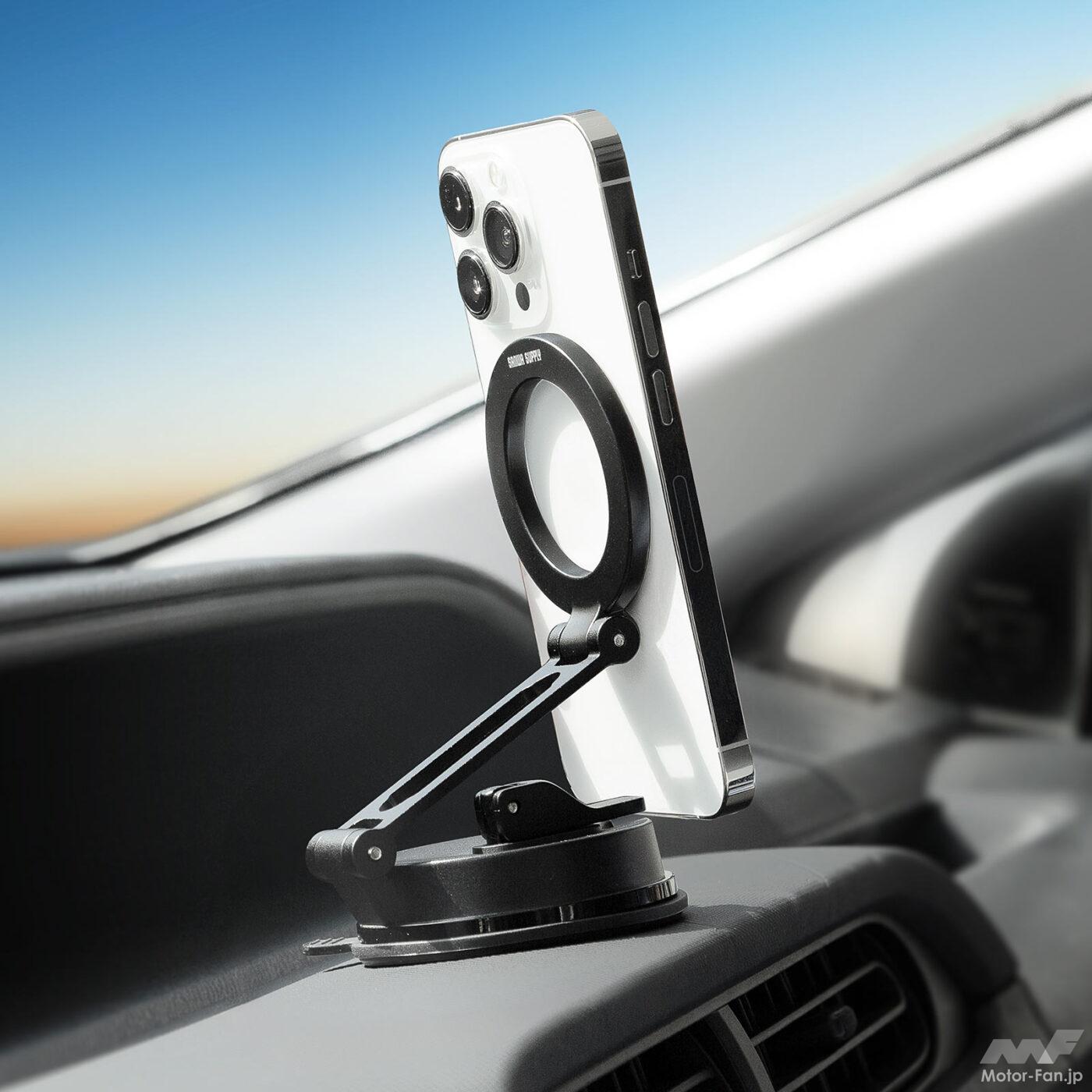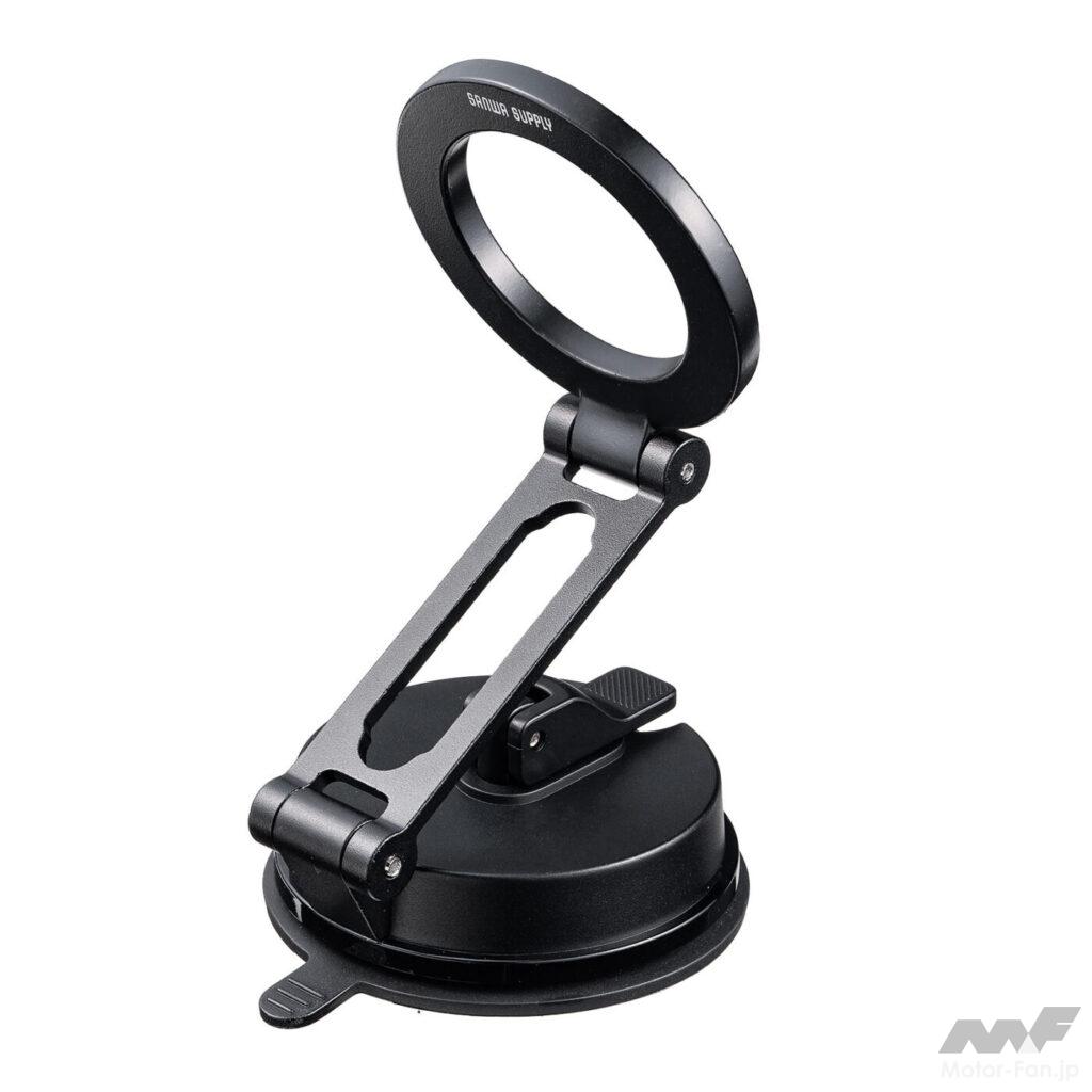 サンワサプライの『200-CAR117』は、iPhoneに搭載されている“MagSafe”を活用できるスマホホルダー。強力なマグネットを採用することで、わずか1秒の素早く確実な取り付けを実現している。走行中の振動にも強く、ズレたり脱落する心配がない。重量300gまでのスマホに適合しており、MagSafe非対応のスマホは付属のメタルリングを取り付けることで利用可能だ。