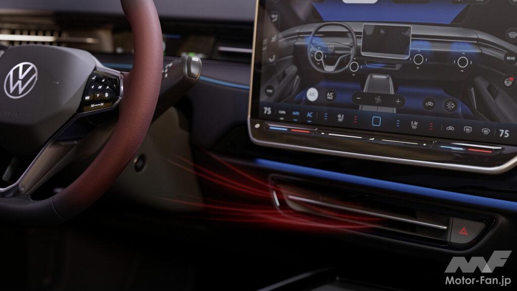 室内空調の制御機能は『ID.7』の新しい38 cm(15インチ)インフォテインメントディスプレイの操作レベル最上部に置かれる。そのため常に表示されており、指でタップするだけでアクティブにできる。メニューを使用して全てのスマートエアベントをデジタル制御できる。空気の流れの強さと方向を直感的に調整して個別に保存できる。温度はバックライト付きのタッチスライダーで制御する。