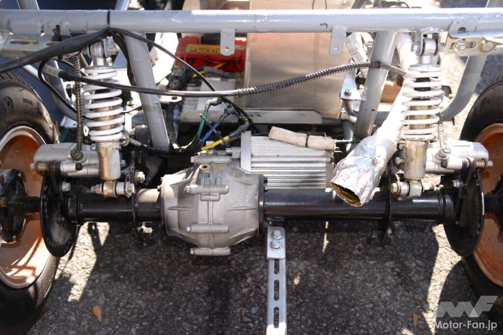 ボディを上げて運転席を見れば、すぐ脇にエンジンが搭載されている。聞けばホンダ製汎用エンジンで、中村さん宅に転がっていた草刈機のもの。ただ、この位置にあるのが不思議だったため聞いてみると「実はこのクルマ、EVなんです。動力は電気モーターなので走ってもエンジン音がない。それでは寂しいのでアクセル開度に応じて回転数が変わるようにした汎用エンジンを載せたんです」とのこと。