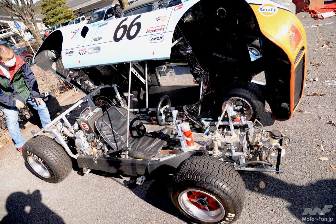 ボディを上げた状態で車体の後ろへ回り込むと、確かに電気モーターが確認できた。つまり電動バギーの駆動系をそのまま使いつつ、汎用エンジンでエンジン音を再現しているのだ。なんとも楽しい乗り物だが、完成までにかかった時間は3年ほど。ただ、すでにボディの型があるそうなので、追加で製作することも可能だろう。ちょっと自分でも欲しいなどと思うようなら、貴方も十分に変態の資質をお持ちだ。もちろん筆者も欲しいと思ったのは言うまでもない。