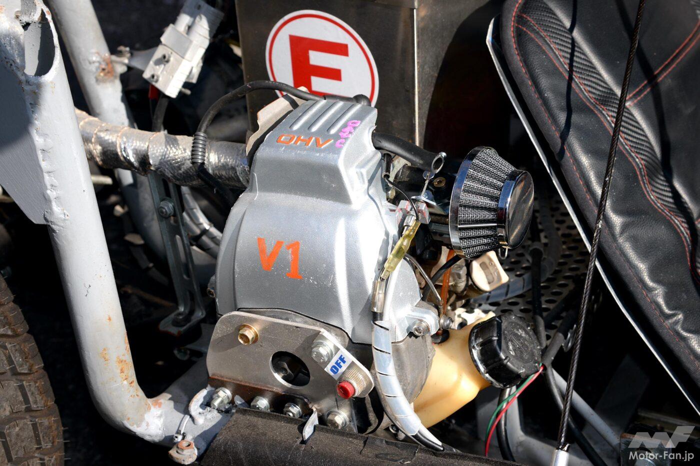 ボディを上げて運転席を見れば、すぐ脇にエンジンが搭載されている。聞けばホンダ製汎用エンジンで、中村さん宅に転がっていた草刈機のもの。ただ、この位置にあるのが不思議だったため聞いてみると「実はこのクルマ、EVなんです。動力は電気モーターなので走ってもエンジン音がない。それでは寂しいのでアクセル開度に応じて回転数が変わるようにした汎用エンジンを載せたんです」とのこと。