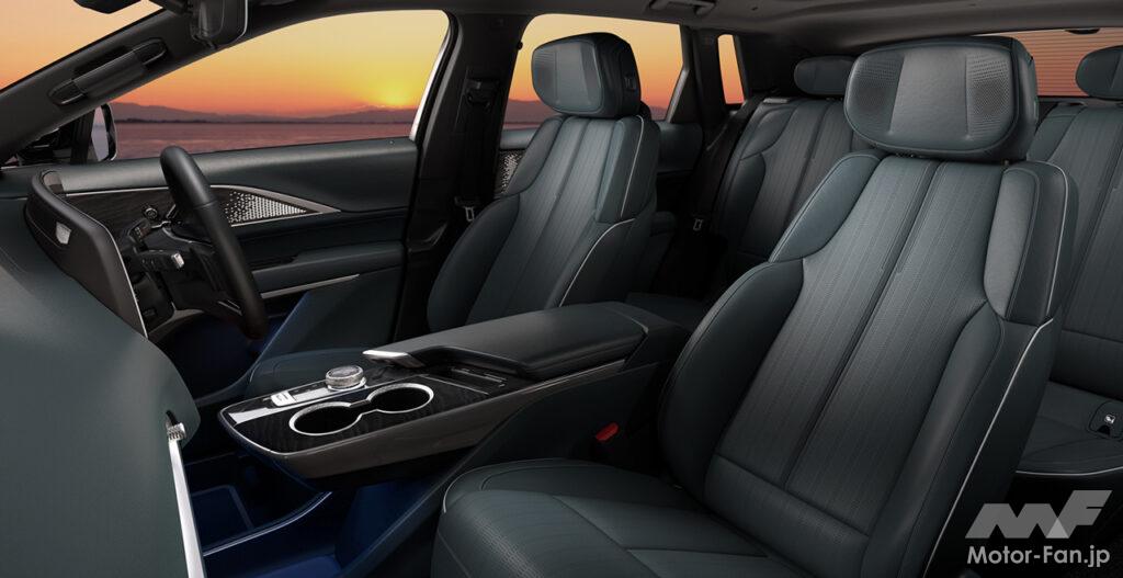 リリックは全長4995×全幅1985×全高1640mm、ホイールベース3085mmという堂々たるサイズの持ち主。流麗なサイドシルエット、ルーフラインや流れるようなAピラーとウエストライン、3mを超えるロングホイールベースが優美で圧倒的なプロポーションを創出。標準装備の21インチホイールとともにラグジュアリーEVにふさわしい風格を放つ。