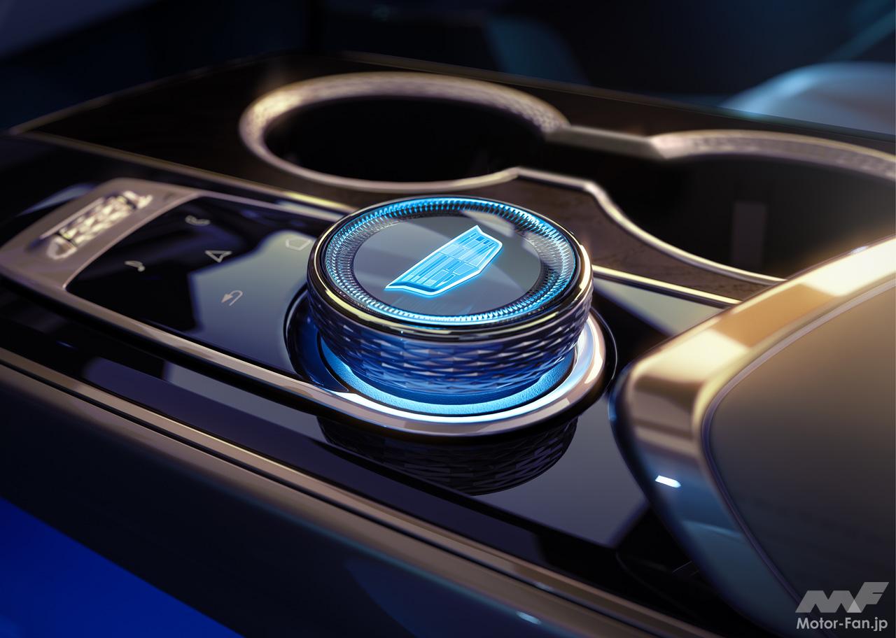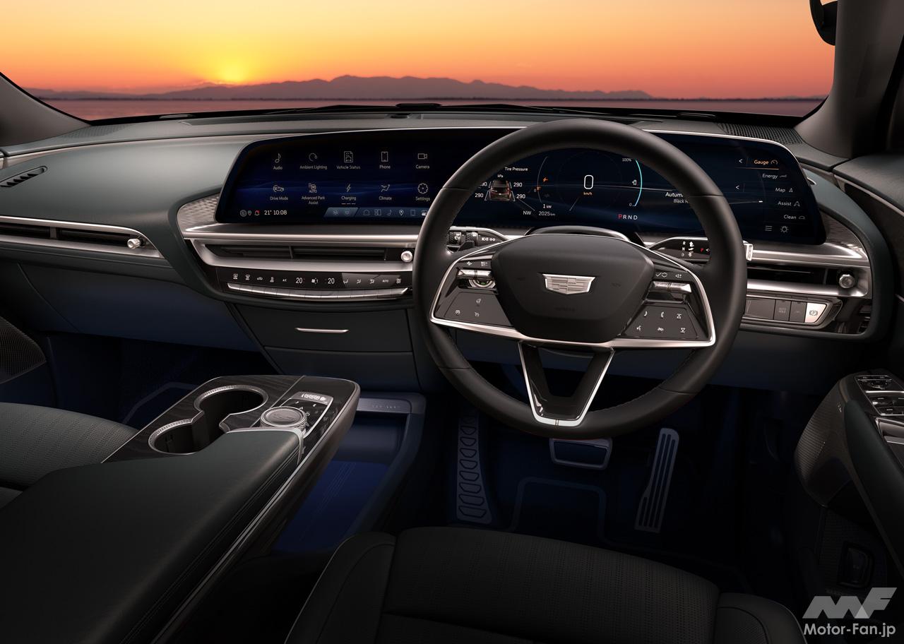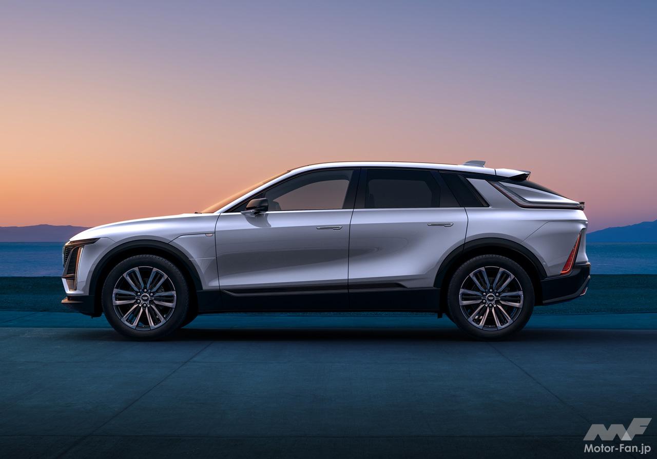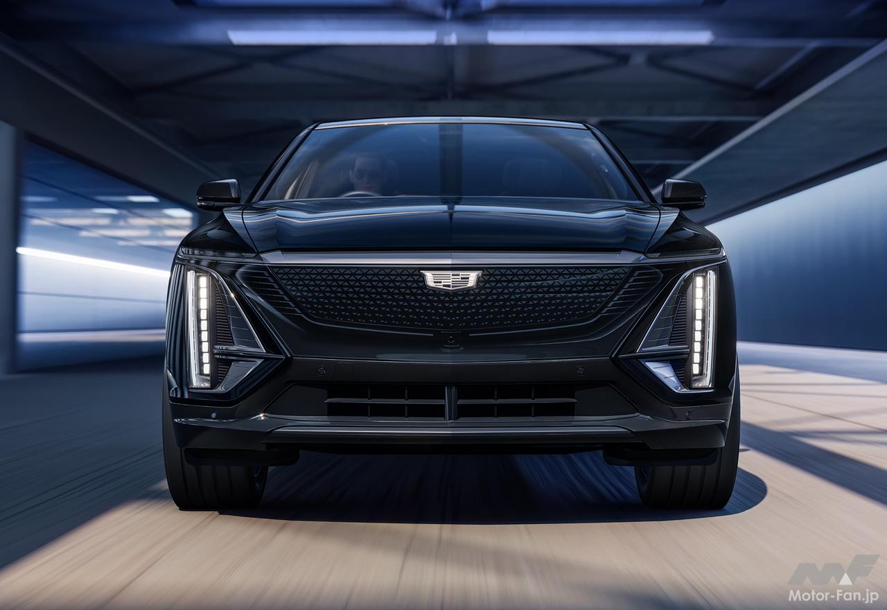 キャデラック・ヘリテージをも受け継ぐ、新世代のキャデラックデザイン言語を採用したフロントフェイスは、ブラックのクリスタルシールドの中央に位置するクリアタイプのキャデラッククレストが、リリックが新世代のBEVであることを印象付ける。また、キャデラックの象徴ともいえる縦長のLEDヘッドランプが、上部のスワイピングLEDウィンカーとともに、存在感ある美しいワイド&ローのフロントスタイリングを際立たせている。
