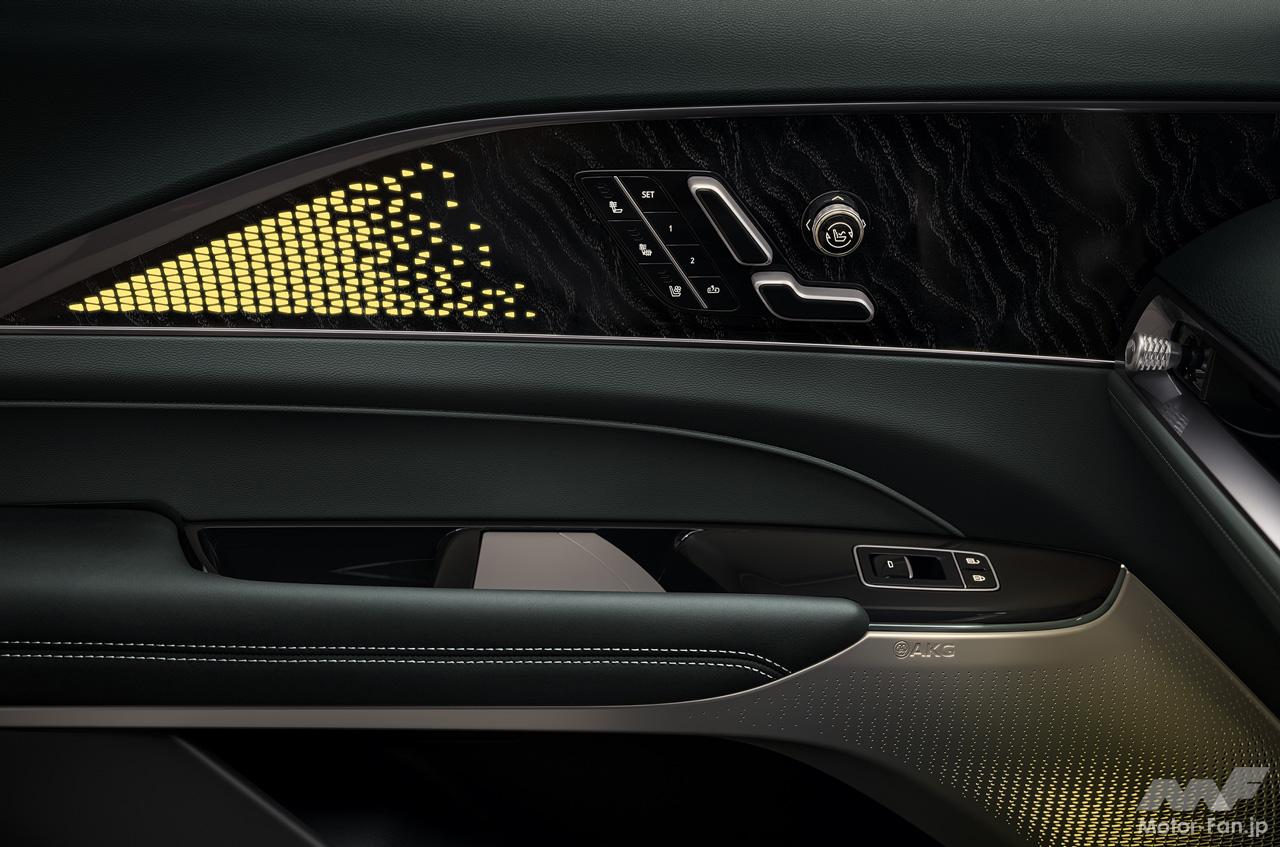 リリックの高剛性ボディは、優れた静粛性にも貢献している。ボディのあらゆる部分に吸音材や制振材を施すことでノイズを減らし、騒音を低減。フロント・サイドの二重ガラスはもちろん、リヤガラスには5mm厚の強化ガラスを採用している。また次世代型のアクティブノイズキャンセレーションを採用。車体四隅に配置した3軸加速度センサーでタイヤからの振動を検知し、キャビン内のマイクセンサーで検知したノイズと合わせて不快な侵入音を打ち消し、高レベルの静寂性を追求している。マイクとヘッドフォンの世界的なブランド、AKGの全19個のスピーカーが全方位から立体的でナチュラルな音響空間を創り出す。