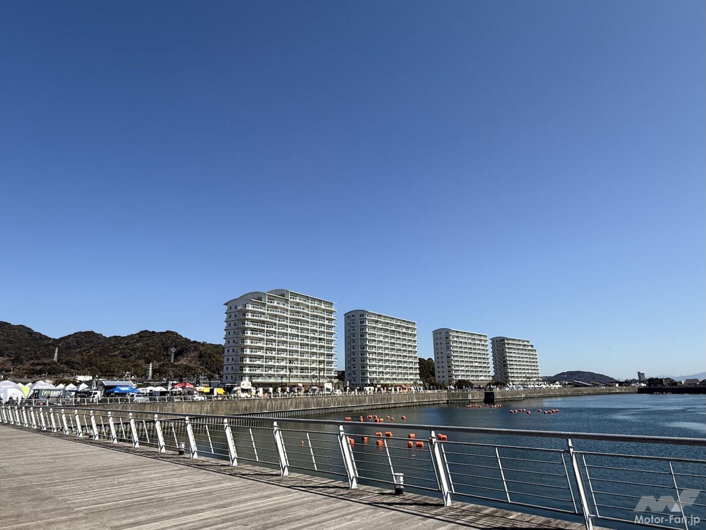 ラリーのサービスパーク周辺には多くのキッチンカーが並ぶ。ステージではトークショーなどのイベント、マリーナでは「蒲郡マリンフェスティバル」が併催されている。