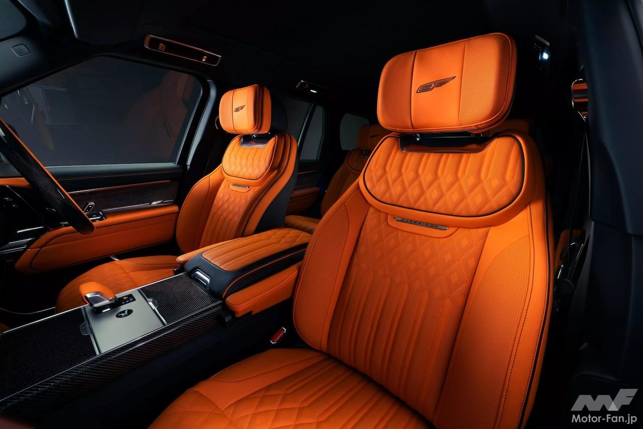標準のレンジローバーのキャビンは、そのままでも非常に豪華だが、オーバーフィンチはそれを独自のものに再設計した。シート、ダッシュボード、ステアリングホイール、センターコンソール、ドアパネルはすべて、しなやかなアランシアオレンジのレザーで覆われ、いくつかのカーボンファイバートリムピースが組み合わされている。