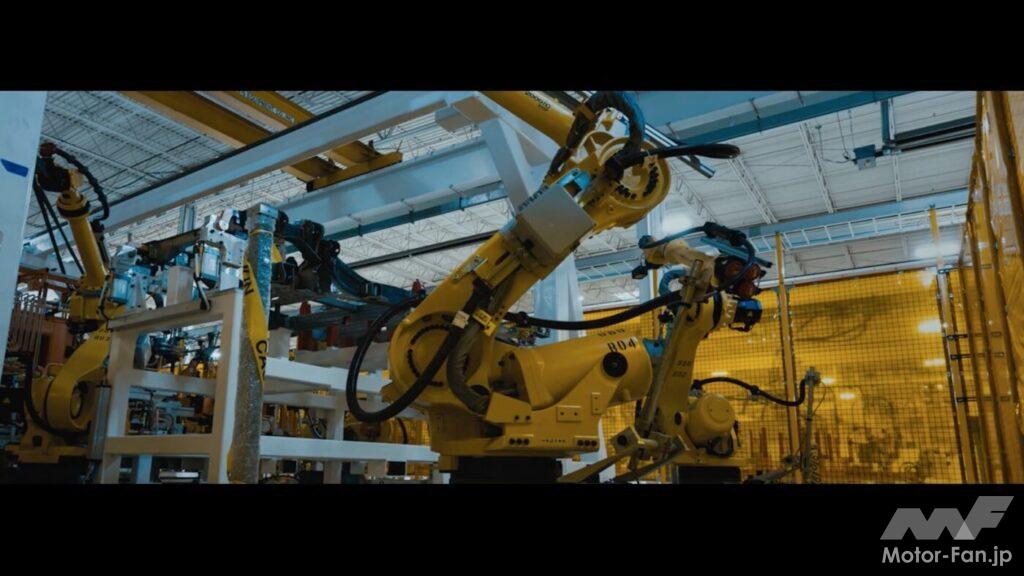 そのスケートボードシャシーのフレーム部分は小さなパーツとしてジグ上で作られたあと、ジグ上で全体を組み上げる【写真12】【写真13】。寸法精度はジグに依存しており、これもトラック的な作り方だ。ドアなどのジグに固定しクランプしたうえでロボットが溶接する方式であり、このあたりの製造工程は「普通のクルマ」だ。
