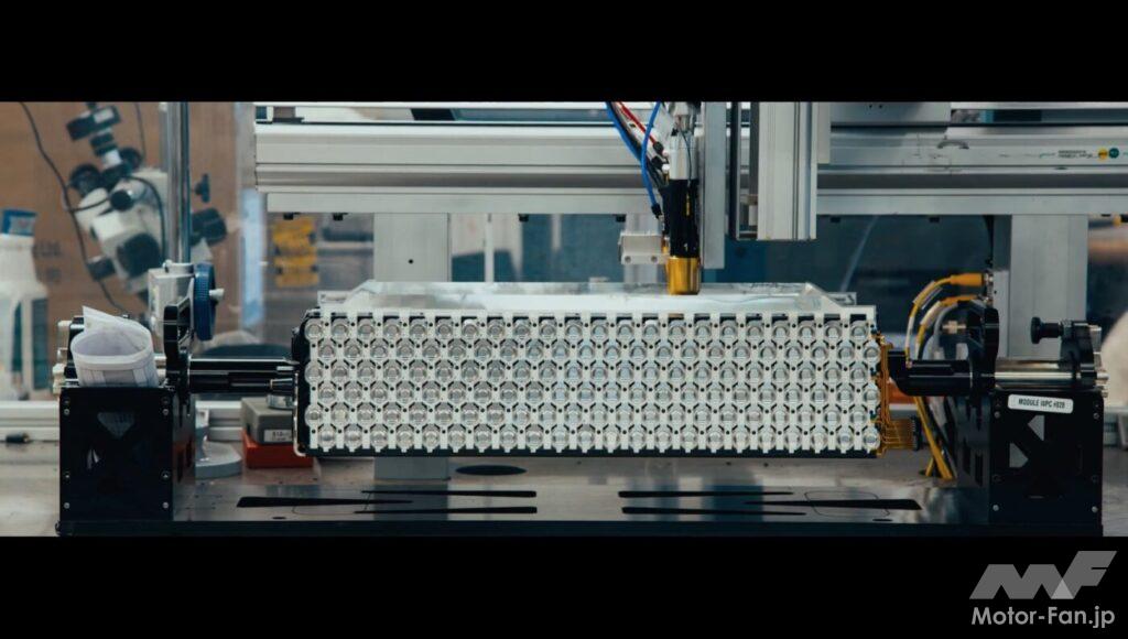 LiBについては資料でまったく触れていないが、製造工程を紹介するビデオに一瞬だけ写っていたシーンには、18650(18mm直径×長さ65mm)のような円筒形電池が見られた【写真14】。264セルを1モジュールにしている。テスラはパナソニックに特注する18650を1台当たり6500本ほど使っているが、カヌーのパイロット生産ビデオを見ると最大16モジュールに見える。16モジュールだとすれば4224本だ。