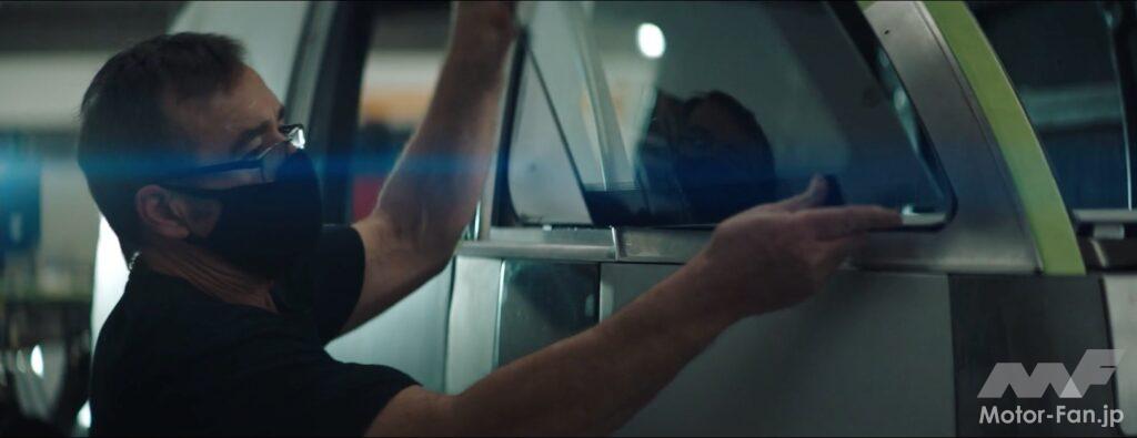 興味深いのは、ライフスタイルビークルの三角窓に樹脂グレージングを使っていると思われる点だ【写真15】。この大きさのガラスは手持ちでボディに位置決めしてくっつけられるような重量ではない。しかも作業はひとりだから、おそらく樹脂窓だろう。接着剤の塗布もロボットではなくて作業と思われる。