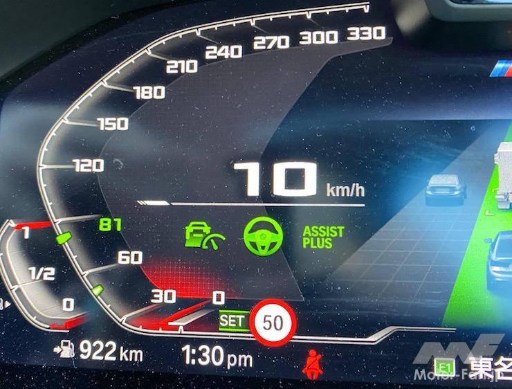 またせっかくなので今回はあえて、途中でハンズ・オフ・アシストを切って、ACC+LKASだけでも試してみた。現行3シリーズのACCは、全車速追従機能付でストップ&ゴー機能付。車両が完全停止してしばらく経っても前の車が進みだせば、前車に追従して進み出す。