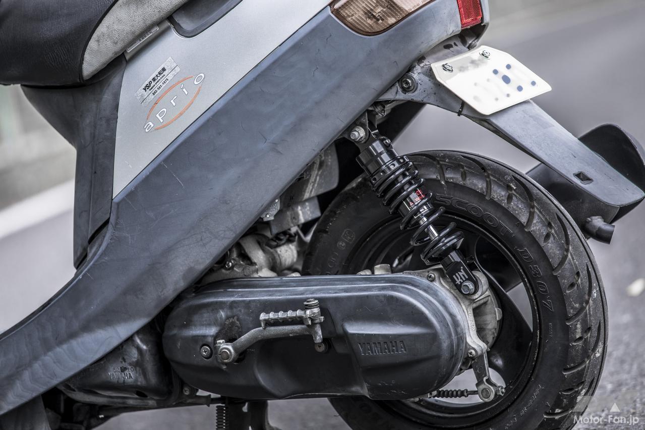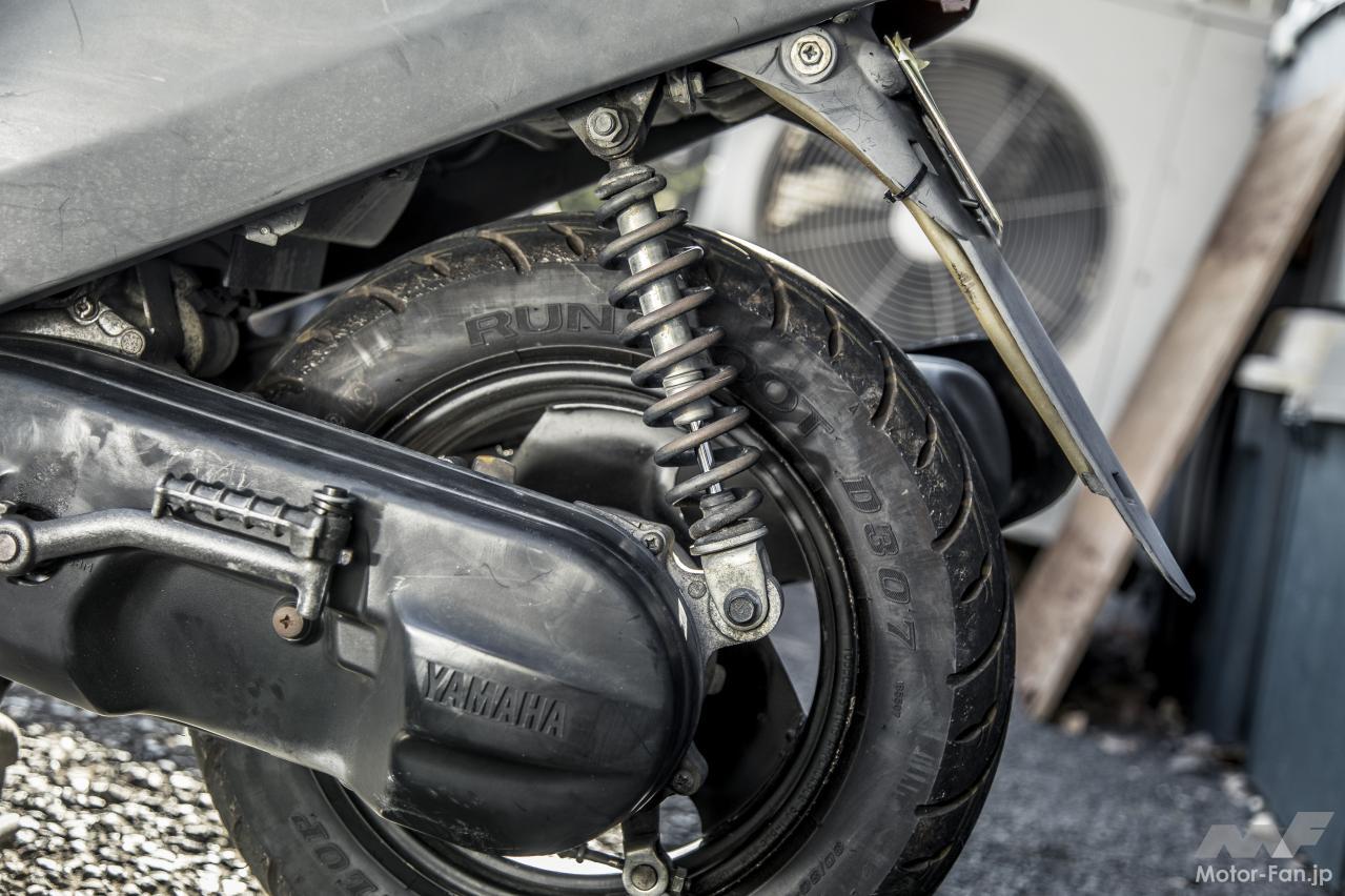 JOGアプリオのリヤタイヤの本来のサイズは80/90-10。しかし、中古で購入した車両には、一回り大きなダンロップRUNSCOOT D307 90/90-10が組まれていた。小径の足まわりゆえのクイックなハンドリングはスポイルされるとはいえ、それでも10インチなので十分に扱いやすく、それでいて安定性がアップしているのでなかなか好印象。ただし、タイヤサイズ(車高)に対して、ノーマルのセンタースタンドでは長さが足りず、バイクを停めるとちょっとフラフラな状態になっていた。さらに今回リヤショックを純正(220mm)からKN企画製(230mm)に変更したことで、センタースタンドと地面との距離がさらに離れてしまう自体に。JOGアプリオよりも取り付け長が長いJOG-ZR純正スタンド(中古で1000円)に交換してこの問題を解消した。