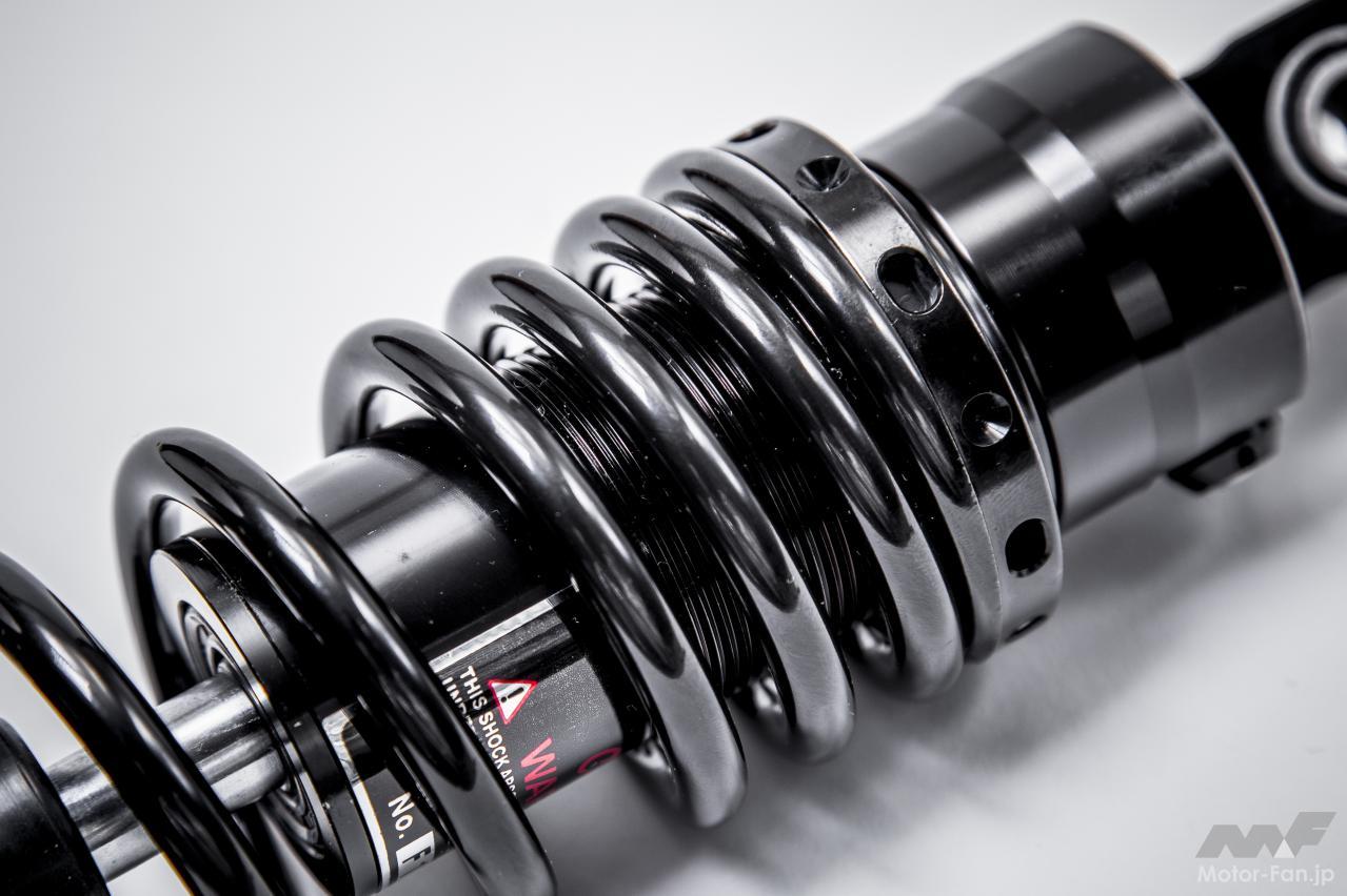 新たに装備するのは、KN企画製(自由長230mm・重量968g・シャフト径12.5mm・バネ径7mm)。純正リヤショック(自由長220mm・重量610g・シャフト径8mm・バネ径6.5mm)よりも重量が300gほど重い。バネ下重量(サスペンション、ホイール、タイヤなど)は軽い方が良いとされているが、剛性とダンパー性能ではKN企画製が圧倒。