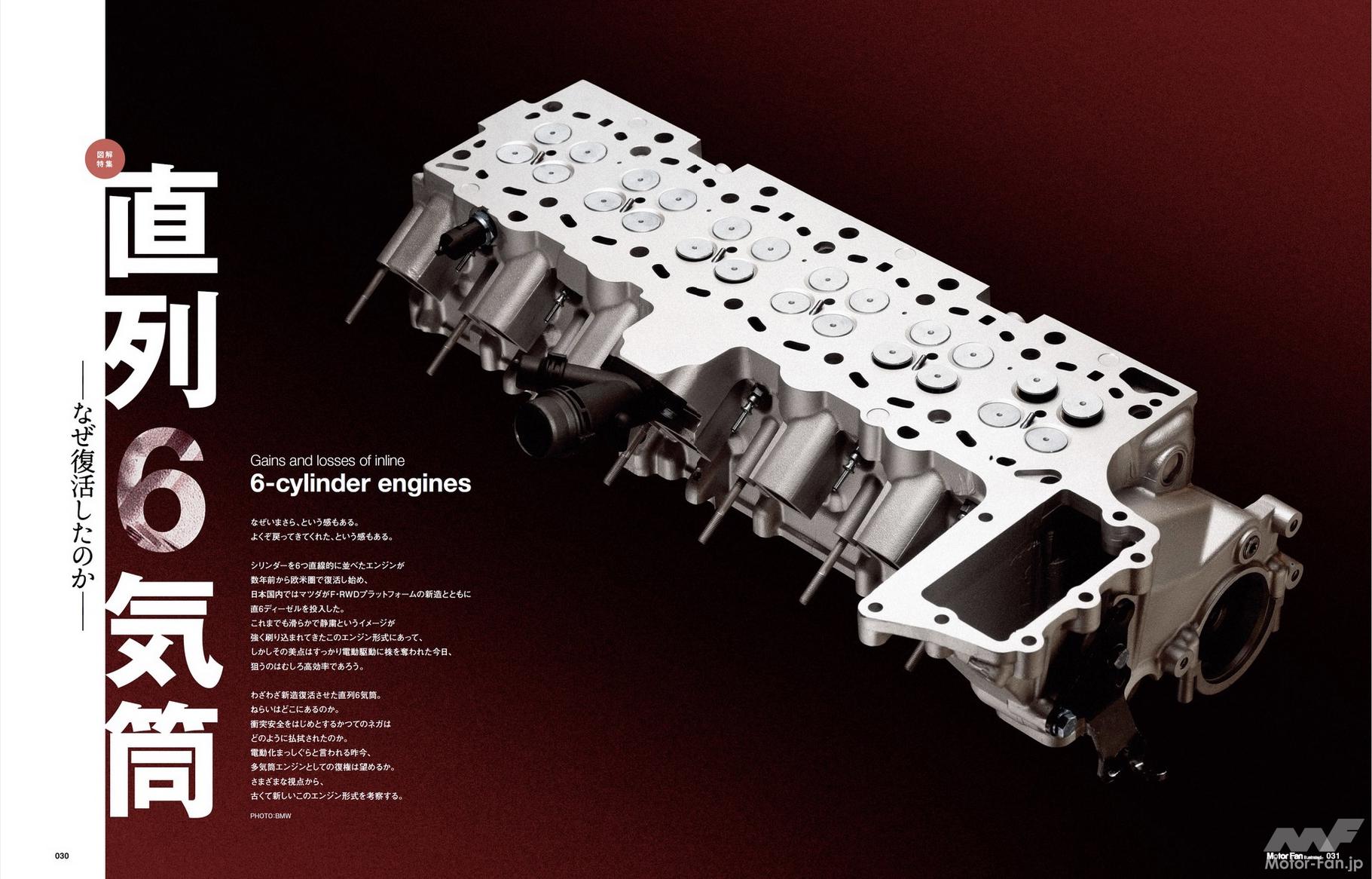 ご存じ、多気筒の最小排気量である6シリンダーについては主流をV型としている会社がほとんどです。かつての直列6気筒フォーマットは衝突安全の観点や駆動方式/パワートレインの積載方式の関係から急速に姿を消し、コンパクトで縦横いずれでも搭載できるV型6気筒に取って代わられました。直列6気筒を堅持していたのは乗用車においてBMWただ一社――ではないのは特集内でもご紹介しておりますのでぜひご一読ください――だったところ、数年前に現れたのがメルセデス・ベンツのモジュール設計直列6気筒エンジンシリーズでした。以来、欧州や北米でも直6が復活、ついにはここ日本でもマツダがSKYACTIVテクノロジーを盛り込む新エンジンを市場投入します。本特集では、なぜ「かつてのエンジン」扱いだった直列6気筒が再びステージに上ることになったのか、各種の取材から考察します。