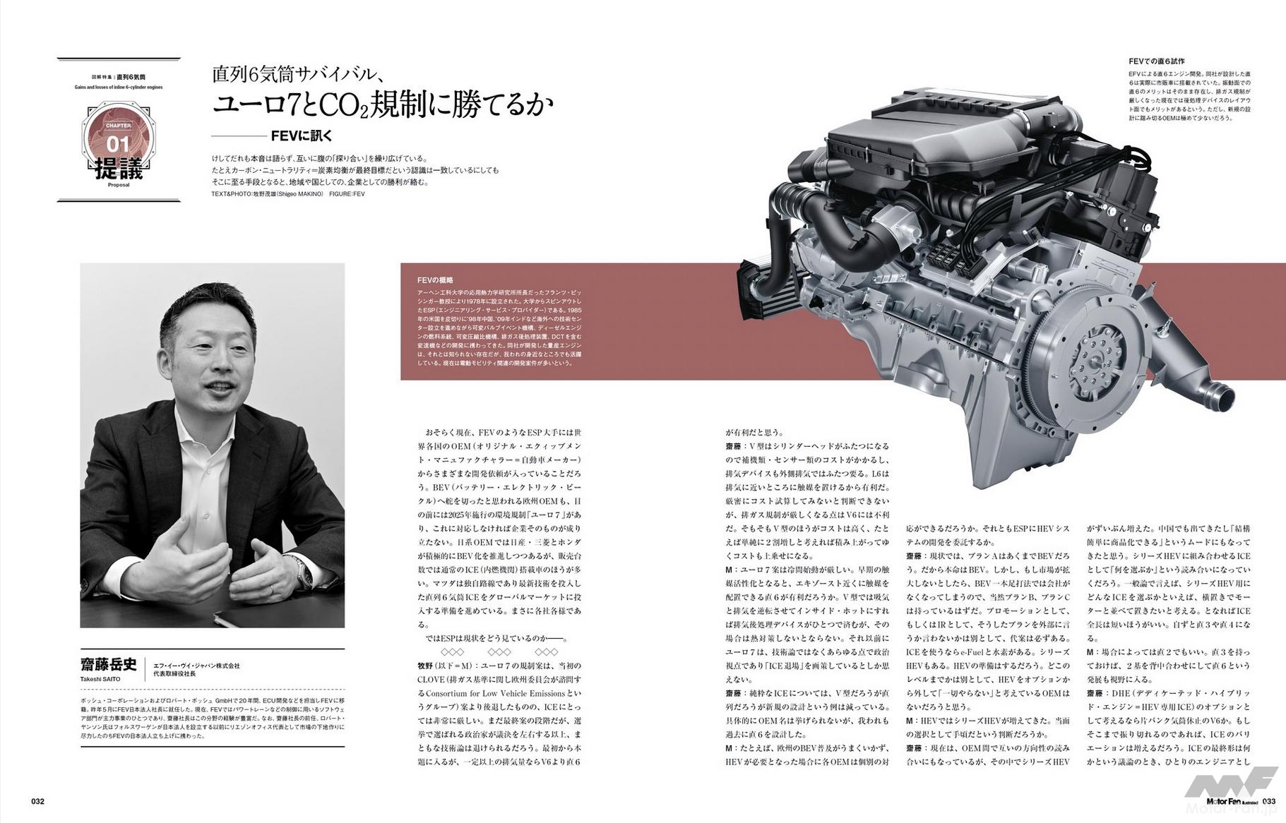 1章「直列6気筒サバイバル:ユーロ7とCO2規制に勝てるか」では、ドイツのエンジニアリング会社・FEVに見識をうかがいました。各社の新造機である直6エンジンが現れた背景は規制。これらの苛烈なレギュレーションが何を定め、それをいかに解決するために直列6気筒が登場したのか。建前と本音の間で揺れ動くエンジン技術開発事情について、同社・齋藤氏にお話をうかがいました。