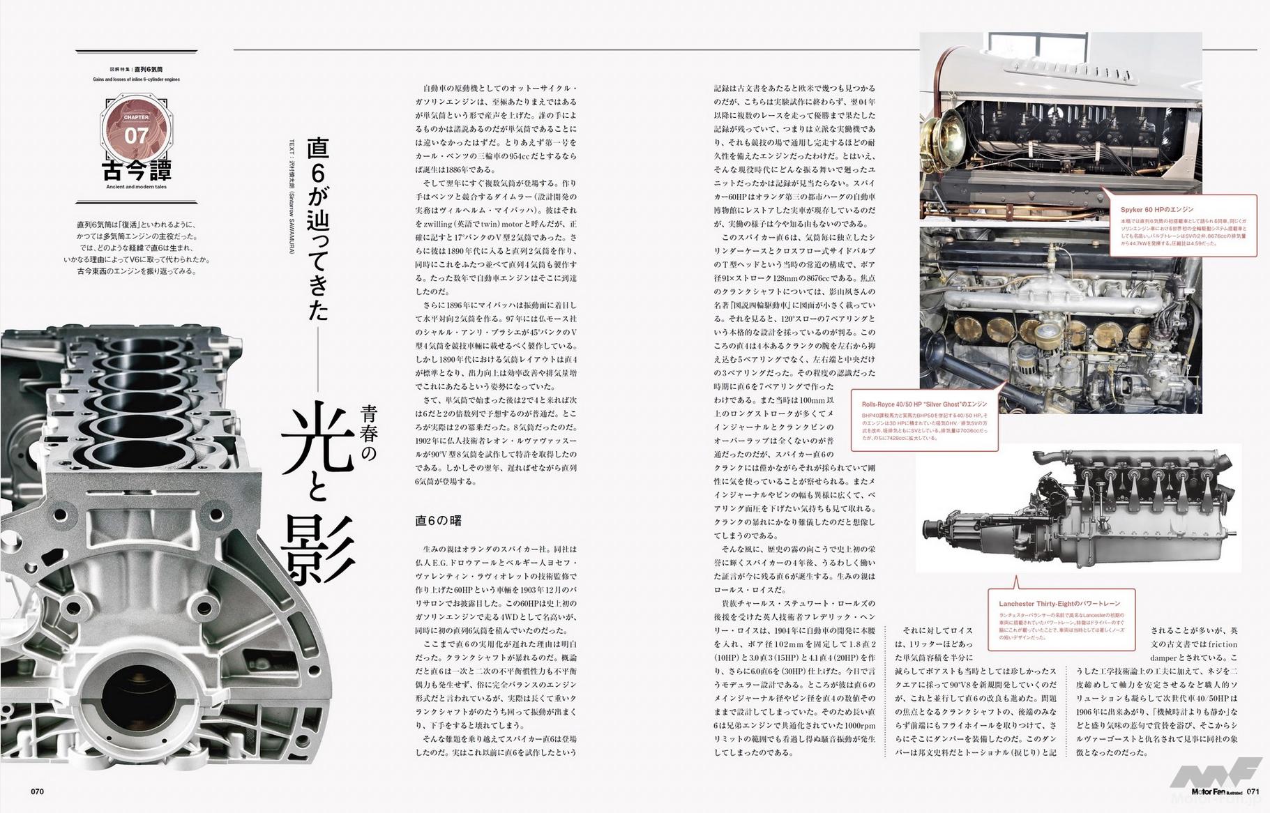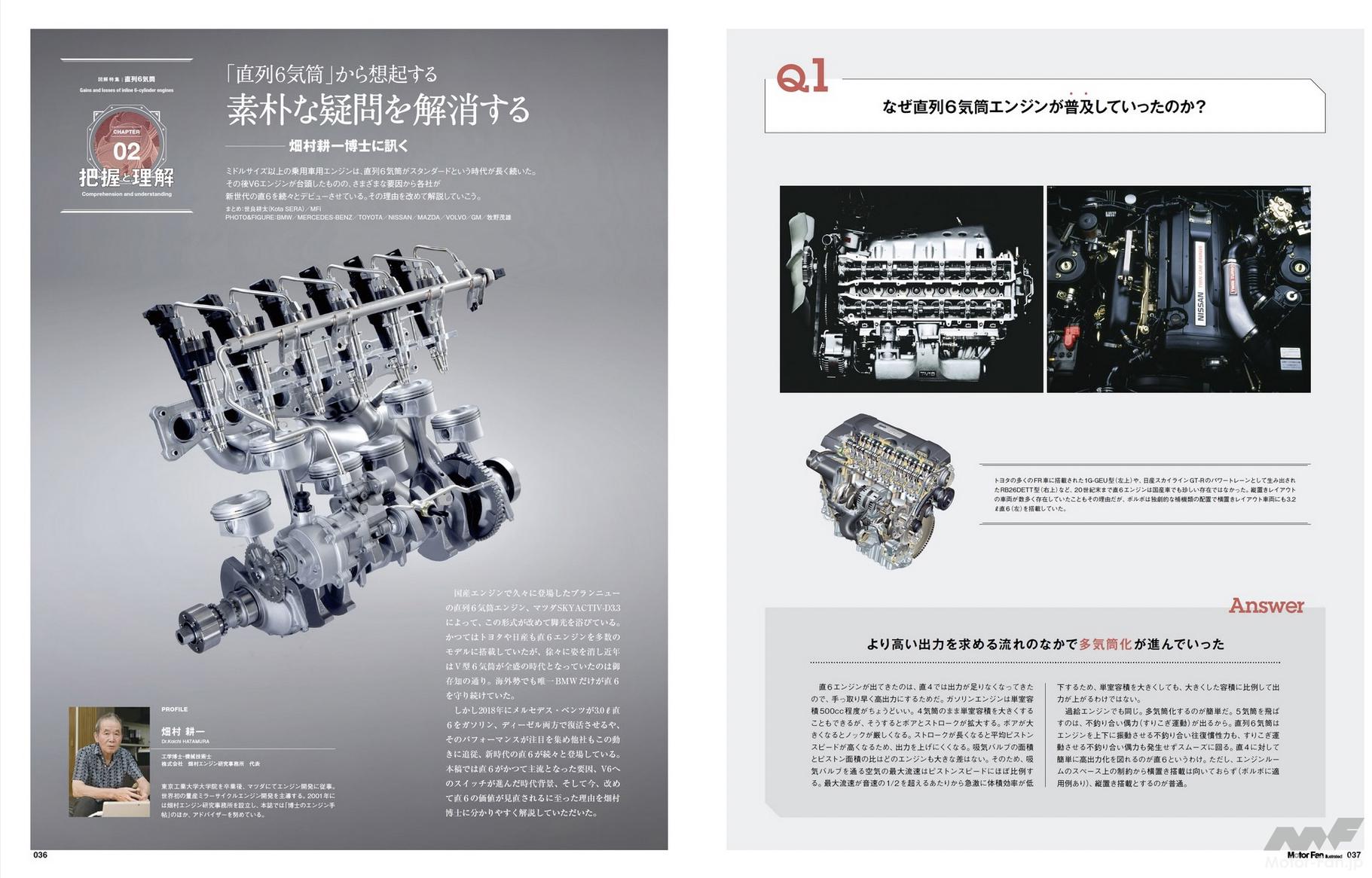 2章「『直列6気筒』から想起する素朴な疑問を解消する」は、一問一答形式のコンテンツです。「なぜ直列6気筒エンジンが普及していったのか」「直6が劣勢となりV6が普及していった理由は」「メインストリームとなったV6エンジンの弱点は」「V6エンジンが主流となった近年、直6が復活したのはなぜ」「新世代直列6気筒エンジンは旧世代とどこが異なるのか」の5問を、MFiお馴染みの畑村耕一博士が回答します。