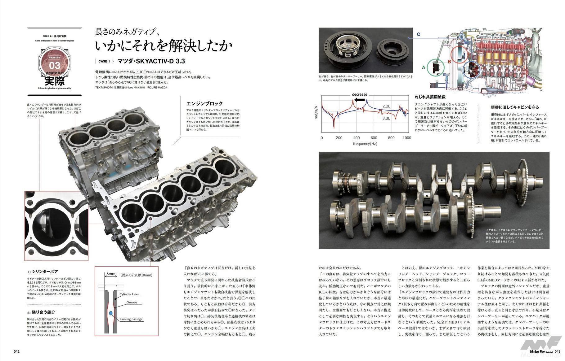 3章「直列6気筒の実際」では、日本国内の直列6気筒エンジンの姿を取材しました。CASE 1は、本特集での主役級エンジン・SKYACTIV-D 3.3について、縦置きパワートレーンとしたときのネガティブ要素:長さをいかに技術的に解決したのか、マツダのエンジニアに取材しました。誌面では、同機のシリンダーブロックやシリンダーヘッドの実物を撮り下ろし、詳細に解説しています。CASE 2は、知る人ぞ知る日産の現役直6・TB型をご紹介します。
