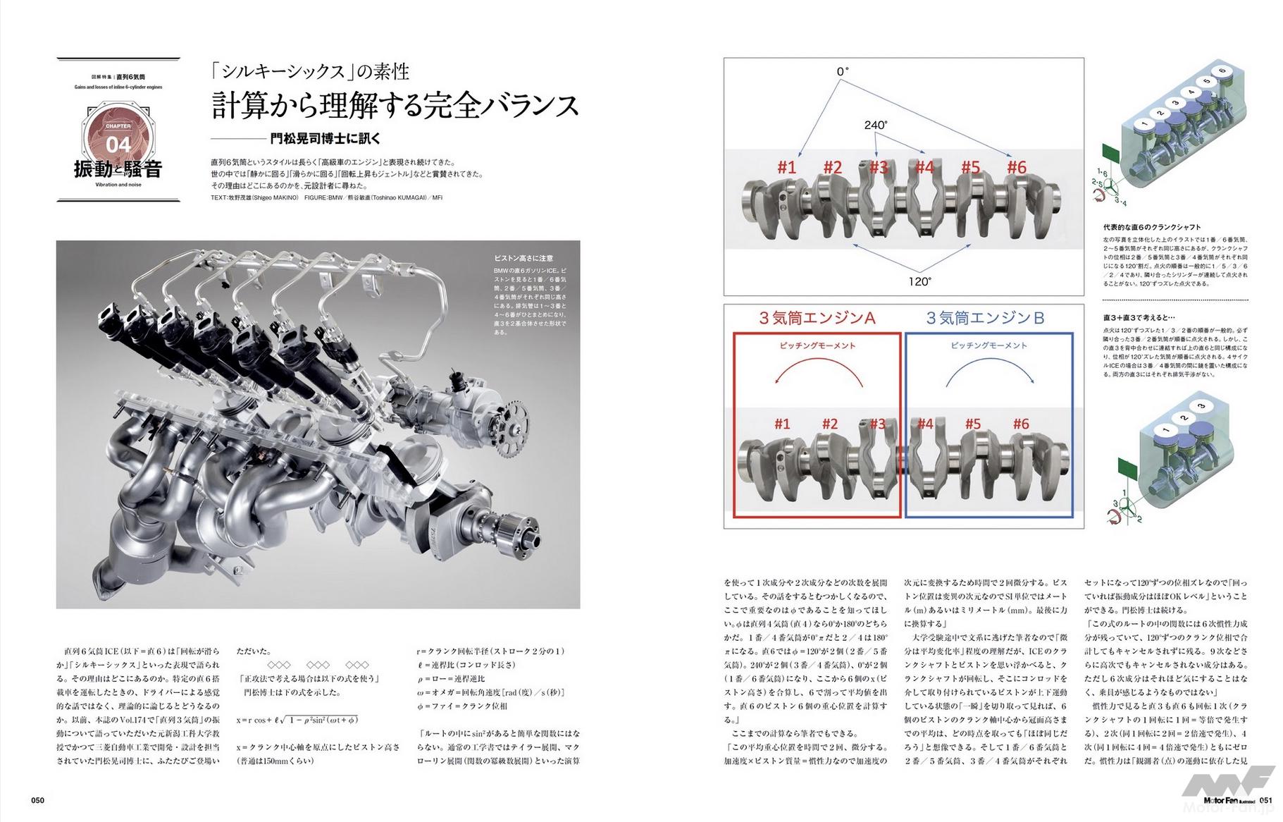 4章「振動と騒音」では、直列6気筒の特性を考察します。「シルキー」や「スムース」といった言葉で表現される直6エンジンについて、ではその言葉に表される現象とはなぜ生じるのか。元新潟工科大学教授の門松晃司博士に教示いただきました。3+3は6、という解説でイメージしやすい方もいらっしゃるのではないでしょうか。
