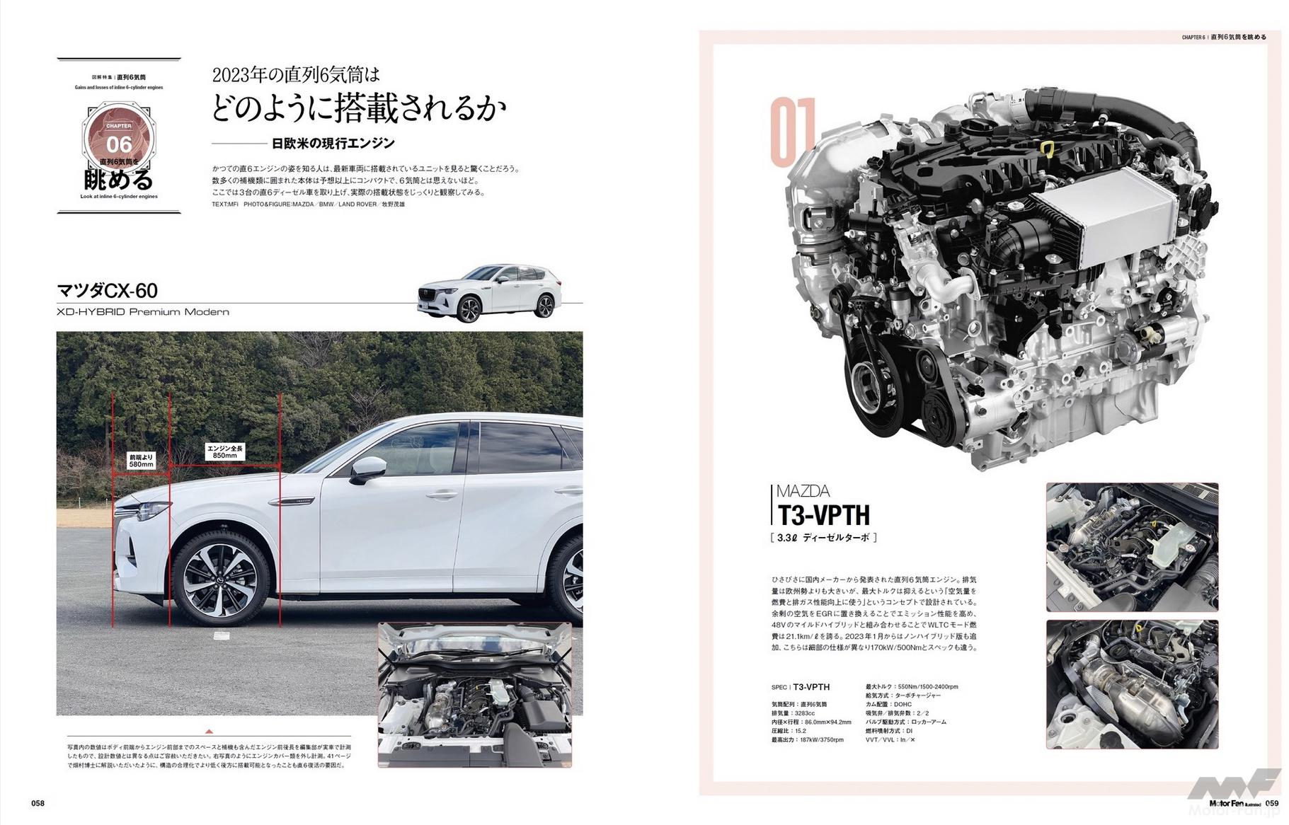 6章「直列6気筒を眺める」は、日欧米の最新エンジンカタログとしています。とくに冒頭の3機種については、実際の搭載車を借り出して採寸撮影、「クルマのどのあたりにどれくらいで載っているのか」を視覚的に表現しました。