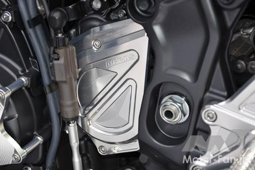 エンジン自体がブラックアウトされているためアクセントにも最適。マシニング加工によってシフトパターンも表記されており、純正カバー同様にカバーされているのでチェーンスラッジが飛び散らないのも嬉しいところ。