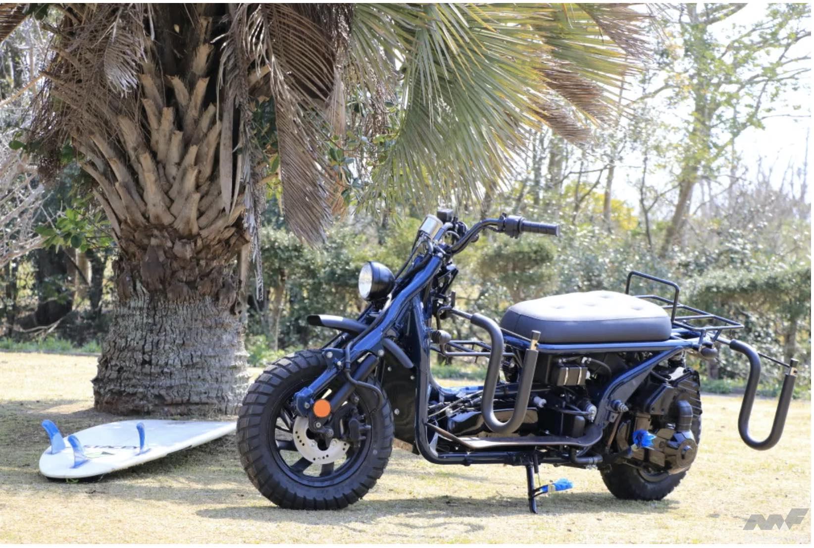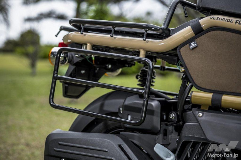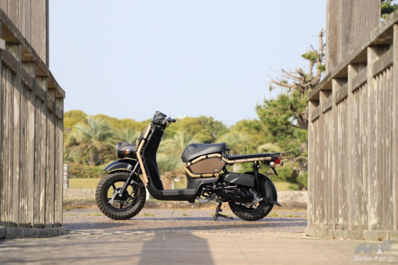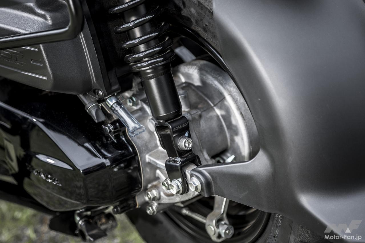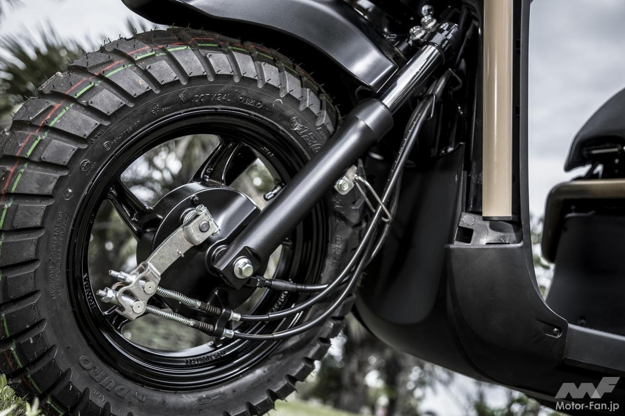 さらに、タイヤはDURO製のセミブロックパターン(HF903:前120/80-12・後120/90-10)を装着しているので、ちょっとした砂利道程度ならガシガシ突っ込んでいける。もっと走破性を高めたいなら、オプションでリフトアップも対応可能だ。