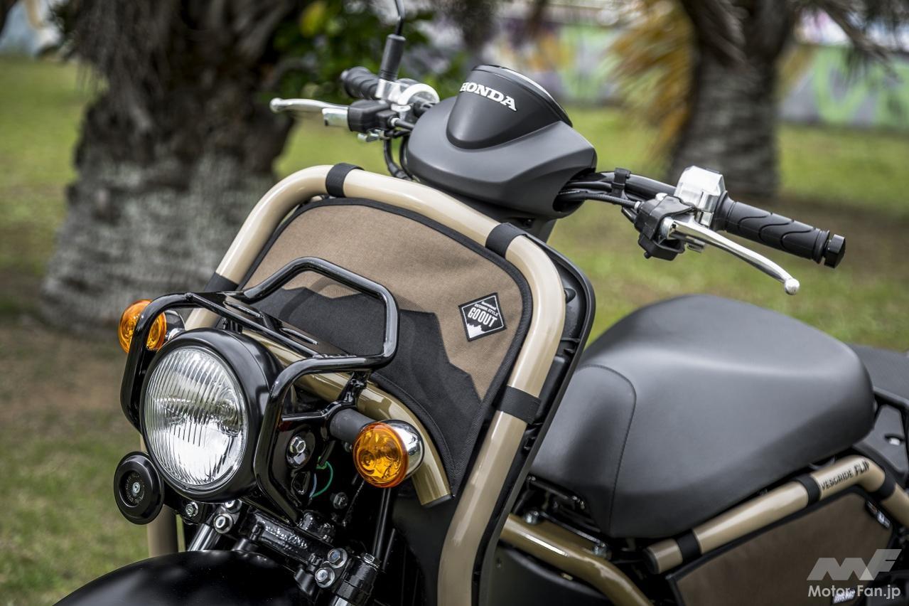 その他のディテールも見どころ満載! まず、ヘッドライトはクロスカブ110用のライトステーごと移植してワイルドな雰囲気を獲得(オプション:38,500円~)。純正よりも約5cm高い位置に配置することで全体のバランスを整えつつ、視認性も高められている。