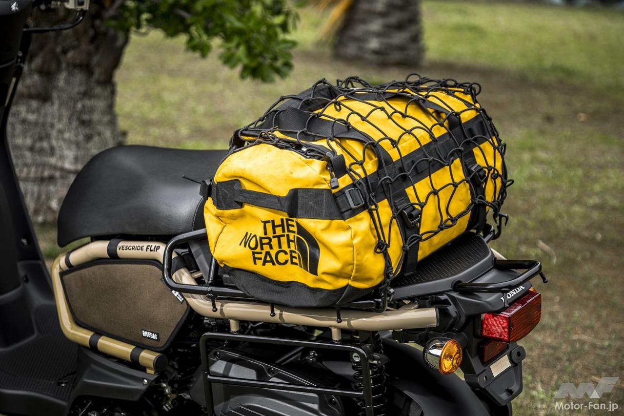 このようにフロントキャリアが追加されたことで積載力が向上! リヤ側も元はビジネススクーターだけに大型のキャリアが備えられているうえ、両サイドのパイプにサイドバッグサポート(オプション:左右各20,900円)を新たに設けてバッグなどが掛けられるようになっている。