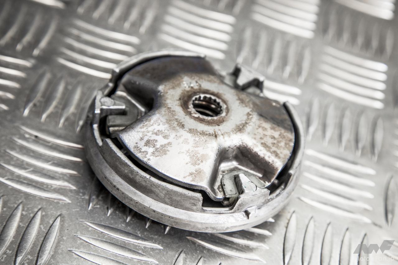 スクーターで後輪出力を計測する場合、駆動系を組んだままでは、計測中に自動で変速してしまう。今回は駆動系が変速しないようにドライブプーリーを固定して、エンジン特性を可視化した。