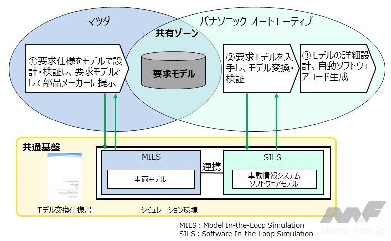 自動車業界では、近年、車載情報制御系システムを中心として、ソフトウェアの大規模化が進み、抜本的な開発の効率化が求められている。これに対し、両社では、モデルベース開発による開発効率化が取り組まれてきた。マツダでは、モデルベース開発をSKYACTIVエンジンの制御に適用し、品質で約10倍の効果が得られている。また、先進安全運転支援システムであるi-ACTIVSENSEなどにも適用が拡大されており、パナソニックグループには電気自動車の電動パワートレイン開発に適用された例がある。