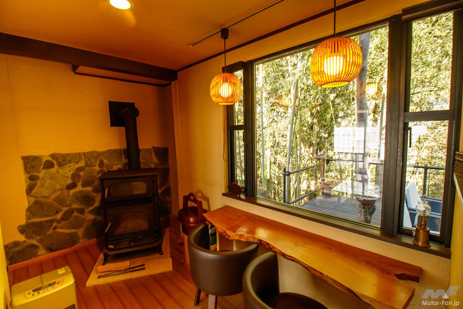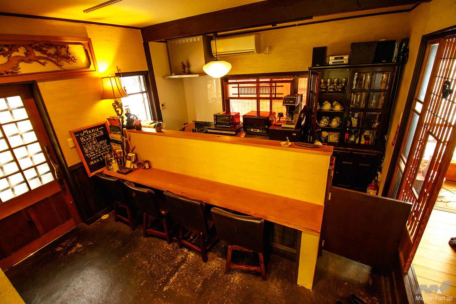 お店の中は暖色の明かりが灯る落ち着いた雰囲気。店内にはカウンター席をはじめ、テーブル席や座敷席があります。靴を脱がずにくつろげる席があるのは、ライダーとしてありがたいですね。天気の良い日はぜひ渓谷を望むテラス席へ。川のせせらぎが心地良いですよ。