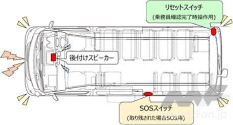 「車内置き去り防止支援システム」は、車両のエンジン停止後、運転者や乗務員へ音声案内で車内に残った人員の確認を促し、確認が実施されない等でスイッチが押されなかった場合、車外へ警報を発する「降車時確認式」の装置となっている。また、万が一車内に取り残された幼児などが、自ら助けを求める際にスイッチを押すことでも車外へ警報を発することが可能。