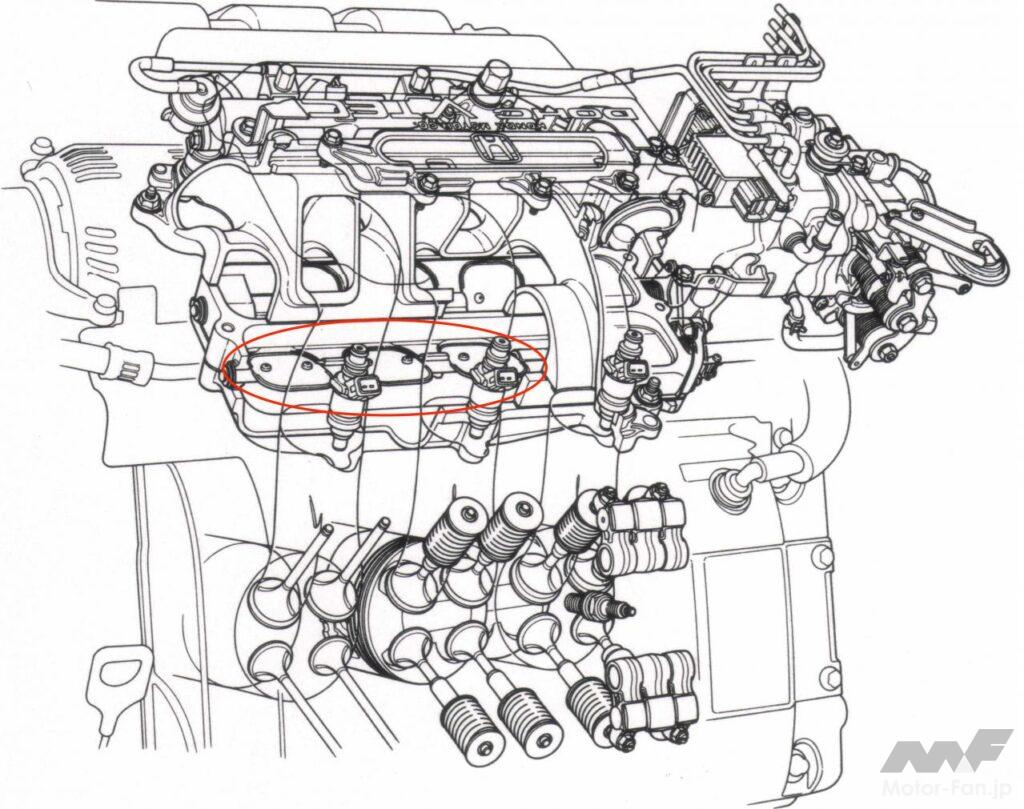 VTECは高低スイッチの2ステージ型。5800rpmを境に、低リフト遅開き早閉じ/大リフト早開き遅閉じが切り替わる。そのままだとトルクカーブに大きな谷が生じることから、それを埋めるために可変長吸気マニフォールドを採用、4800rpmでシャッターバルブを開閉させる共鳴/慣性過給効果と併用することでリニアなトルクカーブを目指した。すなわち、4800rpmまでの低速カム+共鳴効果、4800〜5800rpmの低速カム、5800rpm以上の高速カムという具合である。