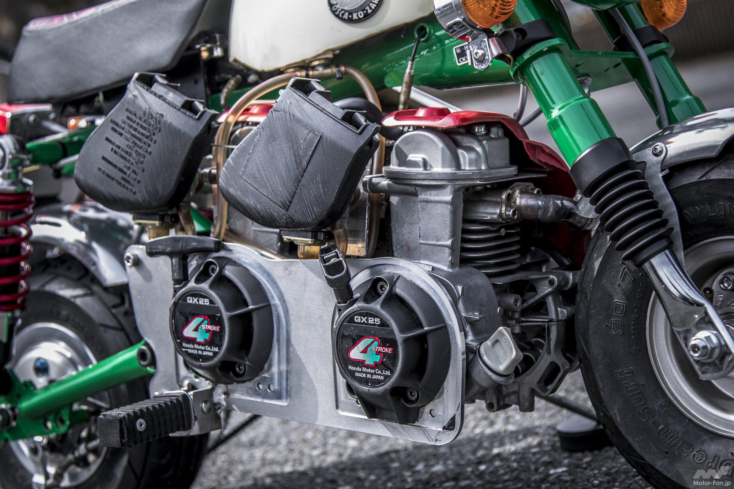 使われた汎用エンジンはホンダGX25で4ストローク単気筒。2基を連結させたといってもそのまま縦に並べただけでクランクシャフトを1本にまとめたわけではない。出力をどう繋げるのか疑問に思うところだが、答えはカンタンでベルトにより2基を繋いでいる。リヤ側エンジンにスプロケットを取り付け、駆動にはチェーンを用いるのはバイクと変わらない。またエンジンを2基搭載するにあたり、吸排気系は大幅に見直されることになった。新たにインテークマニホールドやエキゾースト+マフラーを作り出して、バイクらしい特性が得られるようモディファイされている。
