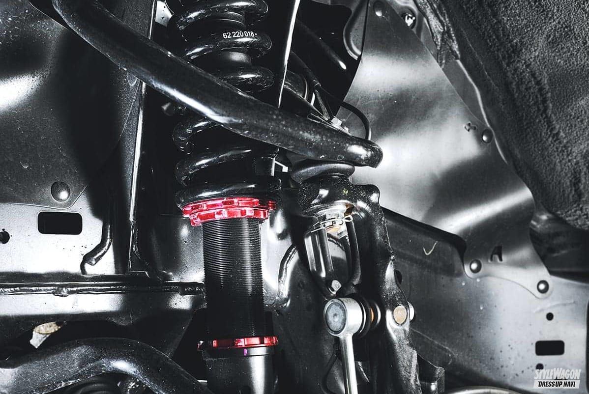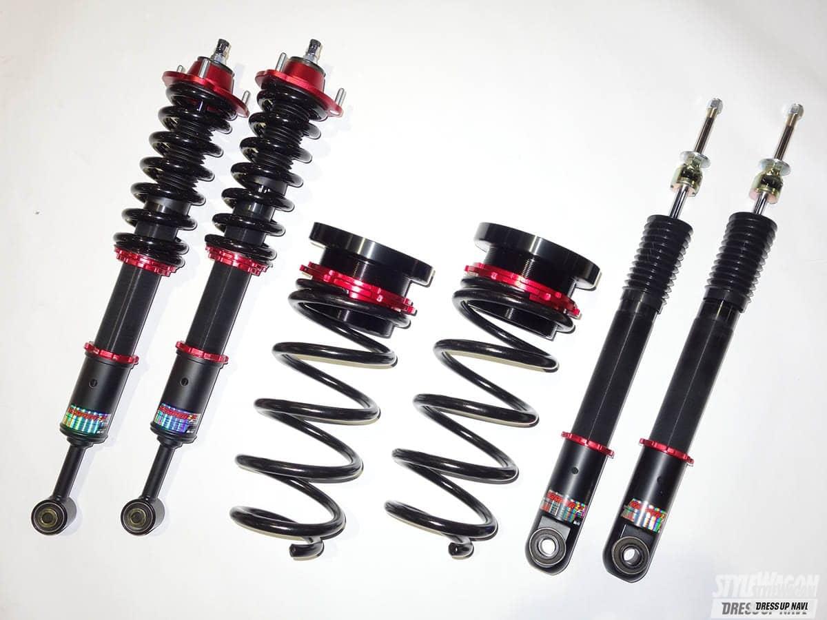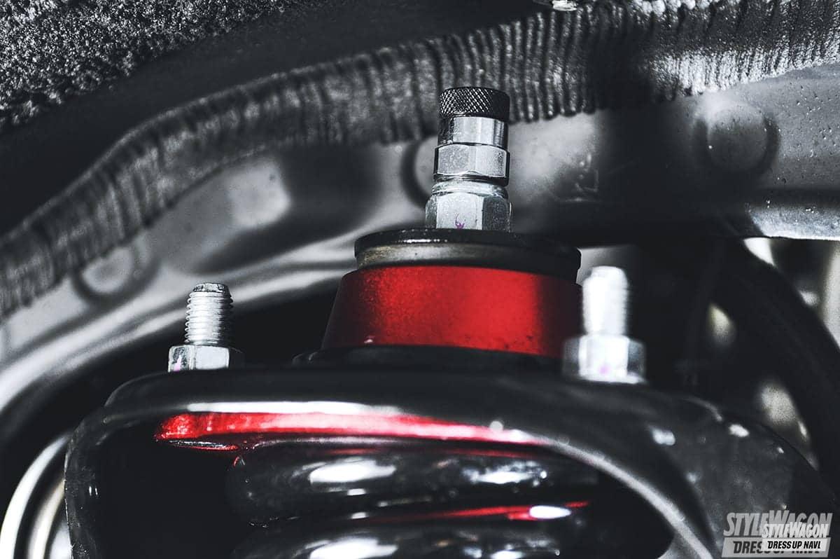 ローダウンでは、圧倒的な人気を誇る車高調キットは、当然、リフトアップ向けにもリリースされている。一番の特徴は、その名前のとおり、車高をミリ単位で調整できること。例えば、前下がり/後ろ下がりなど、自分の気になる部分を補正することもできるし、普段は純正車高近くにしておいて、いざキャンプに行くときはアゲるということも可能。さらに、減衰力調整機能が付いていれば、乗り味を変更することもできるので、自分流セッティングも自在だ。